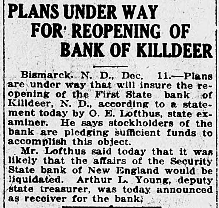 PLANS UNDER WAY FOR REOPENING OF BANK OF KILLDEER Bismarck. N. D., Dec. 11.-Plans are under way that will insure the reopening of the First State bank of Killdeer, N. D., according to a statement today by O. E. Lofthus, state examiner. He says stockholders of the bank are pledging sufficient funds to accomplish this object. Mr. Lofthus said today that it was likely that the affairs of the Security State bank of New England would be liquidated. Arthur L. Young, deputy state treasurer, was today announced as receiver for the bank,