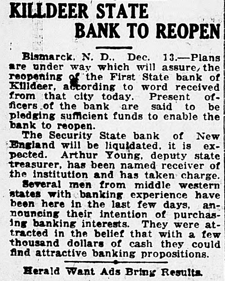 KILLDEER STATE BANK TO REOPEN Bismarck. N. D.. Dec. 13.-Plans are under way which will assure, the reopening of the First State bank of Killdeer, according to word received from that city today. Present officers of the bank are said to be pledging sufficient funds to enable the bank to reopen. The Security State bank of New England will be liquidated. it is expected. Arthur Young, deputy state treasurer, has been named receiver of the institution and has taken charge. Several men from middle western states with banking experience have been here in the last few days, announcing their intention of purchasing banking interests. They were attracted in the belief that with a few thousand dollars of cash they could find attractive banking propositions. Herald Want Ads Bring Results.