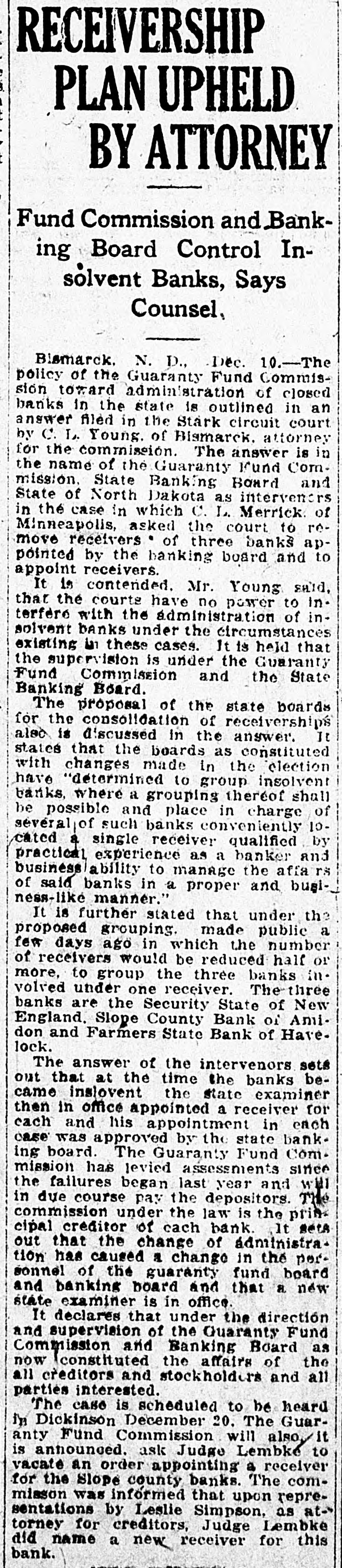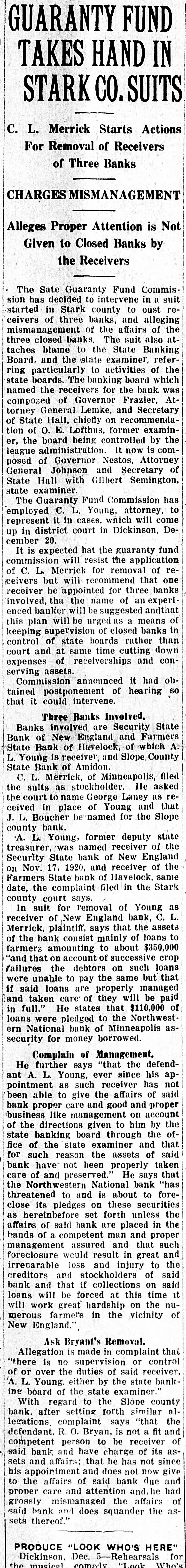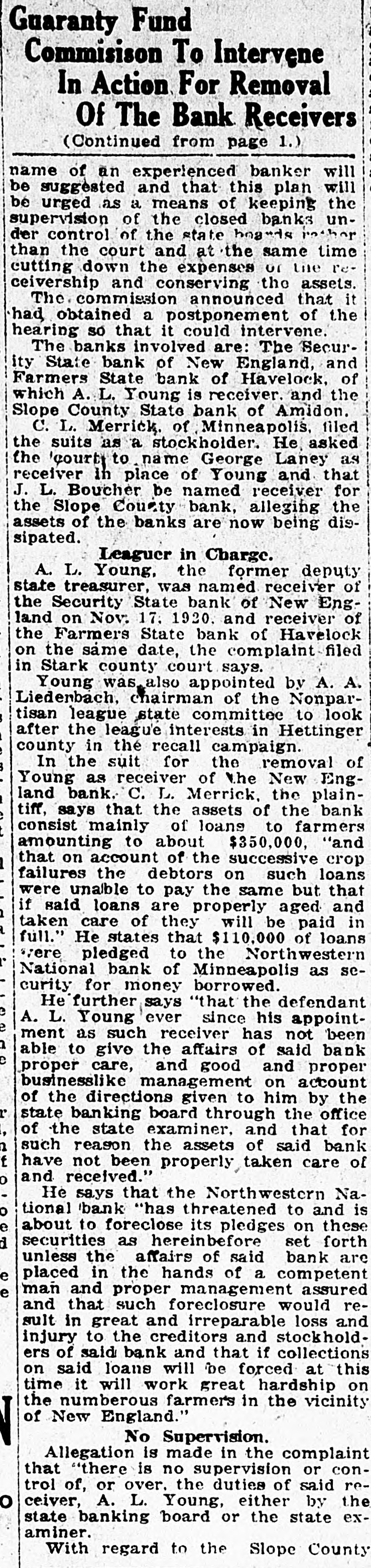Guaranty Fund Commisison To Intervene In Action For Removal Of The Bank Receivers (Continued from page 1.) name of an experienced banker will be suggested and that this plan will be urged as a means of keeping the supervision of the closed banks under control of the state bag"t rather than the court and at the same time cutting down the expenses or the receivership and conserving the assets. The commission announced that it had obtained a postponement of the hearing so that it could intervene. The banks involved are: The Security State bank of New England, and Farmers State bank of Havelock, of which A. L. Young is receiver. and the Slope County State bank of Amidon. L. Merrick. of Minneapolis, filed the suits as a stockholder. He asked the 'court to name George Laney as receiver in place of Young and that J. L. Boucher be named receiver for the Slope County bank, alleging the assets of the banks are now being dissipated. Leaguer in Charge. A. L. Young, the former deputy state treasurer, was named receiver of the Security State bank of New England on Nov. 17. 1920. and receiver of the Farmers State bank of Havelock on the same date, the complaint filed in Stark county court says. Young was also appointed by A. A. Liedenbach, chairman of the Nonpartisan league state committee to look after the league interests in Hettinger county in the recall campaign. In the suit for the removal of Young as receiver of the New England bank. C. L. Merrick, the plaintiff, says that the assets of the bank consist mainly of loans to farmers amounting to about $350,000, 'and that on account of the successive crop failures the debtors on such loans were unable to pay the same but that if said loans are properly aged and taken care of they will be paid in full." He states that $110,000 of loans were pledged to the Northwestern National bank of Minneapolis as security for money borrowed. He further says "that the defendant A. L. Young ever since his appointment as such receiver has not been able to give the affairs of said bank proper care, and good and proper businesslike management on account of the directions given to him by the state banking board through the office of the state examiner. and that for such reason the assets of said bank have not been properly taken care of and received." He says that the Northwestern National bank "has threatened to and is about to foreclose its pledges on these securities as hereinbefore set forth unless the affairs of said bank are placed in the hands of a competent man and proper management assured and that such foreclosure would result in great and irreparable loss and injury to the creditors and stockhold ers of said bank and that if collections on said loans will be forced at this time it will work great hardship on the numberous farmers in the vicinity of New England." No Supervision. Allegation is made in the complaint that "there is no supervision or control of, or over. the duties of said receiver, A. L. Young, either by the state banking board or the state examiner. With regard to the Slope County