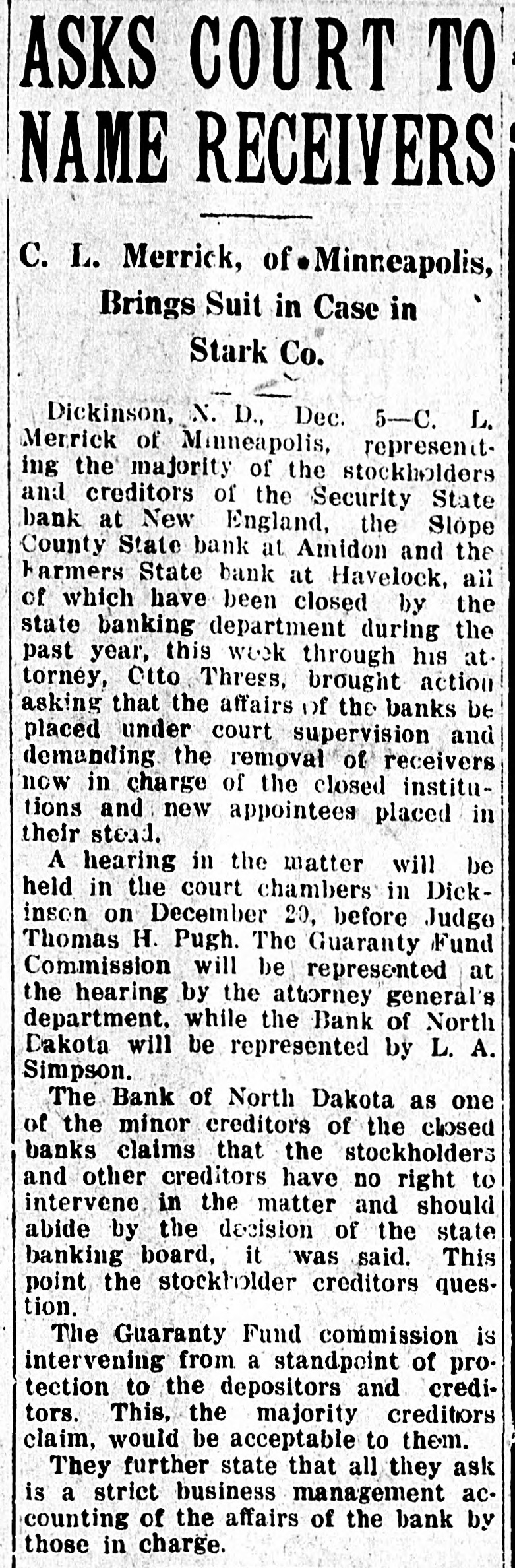 ASKS COURT TO NAME RECEIVERS C. L. Merrick, of Minneapolis, Brings Suit in Case in Stark Co. Dickinson, N. D., Dec. 5-C. L. Merrick of Minneapolis, represent ing the majority of the stockholders and creditors of the Security State bank at New England, the Slope County State bank at Amidon and the harmers State bank at Havelock, all of which have been closed by the state banking department during the past year, this week through his at torney, Ctto Thress, brought action asking that the affairs of the banks be placed under court supervision and demanding the removal of receivers now in charge of the closed institutions and new appointees placed in their stead. A hearing in the matter will be held in the court chambers in Dickinson on December 20, before Judge Thomas H. Pugh. The Guaranty Fund Commission will be represented at the hearing by the attorney general's department. while the Bank of North Dakota will be represented by L. A. Simpson. The Bank of North Dakota as one of the minor creditors of the closed banks claims that the stockholders and other creditors have no right to intervene in the matter and should abide by the decision of the state banking board, it was said. This point the stockholder creditors question. The Guaranty Fund commission is intervening from a standpoint of protection to the depositors and creditors. This, the majority creditors claim, would be acceptable to them. They further state that all they ask is a strict business management accounting of the affairs of the bank by those in charge.