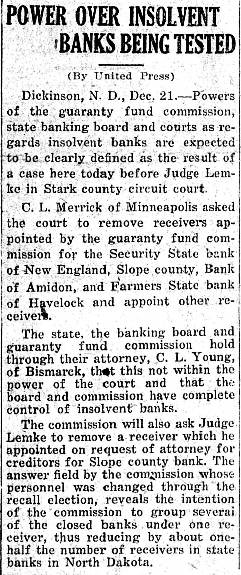 POWER OVER INSOLVENT BANKS BEING TESTED (By United Press) Dickinson, N. D., Dec. 21.-Powers of the guaranty fund commission, state banking board and courts as regards insolvent banks are expected to be clearly defined as the result of a case here today before Judge Lemke in Stark county circuit court. C.L. Merrick of Minneapolis asked the court to remove receivers appointed by the guaranty fund commission for the Security State bank of New England, Slope county, Bank of Amidon, and Farmers State bank of Havelock and appoint other receivers. The state, the banking board and guaranty fund commission hold through their attorney, C. L. Young, of Bismarck, that this not within the power of the court and that the board and commission have complete control of insolvent banks. The commission will also ask Judge Lemke to remove a receiver which he appointed on request of attorney for creditors for Slope county bank. The answer field by the commission whose personnel was changed through the recall election, reveals the intention of the commission to group several of the closed banks under one receiver, thus reducing by about onehalf the number of receivers in state banks in North Dakota.