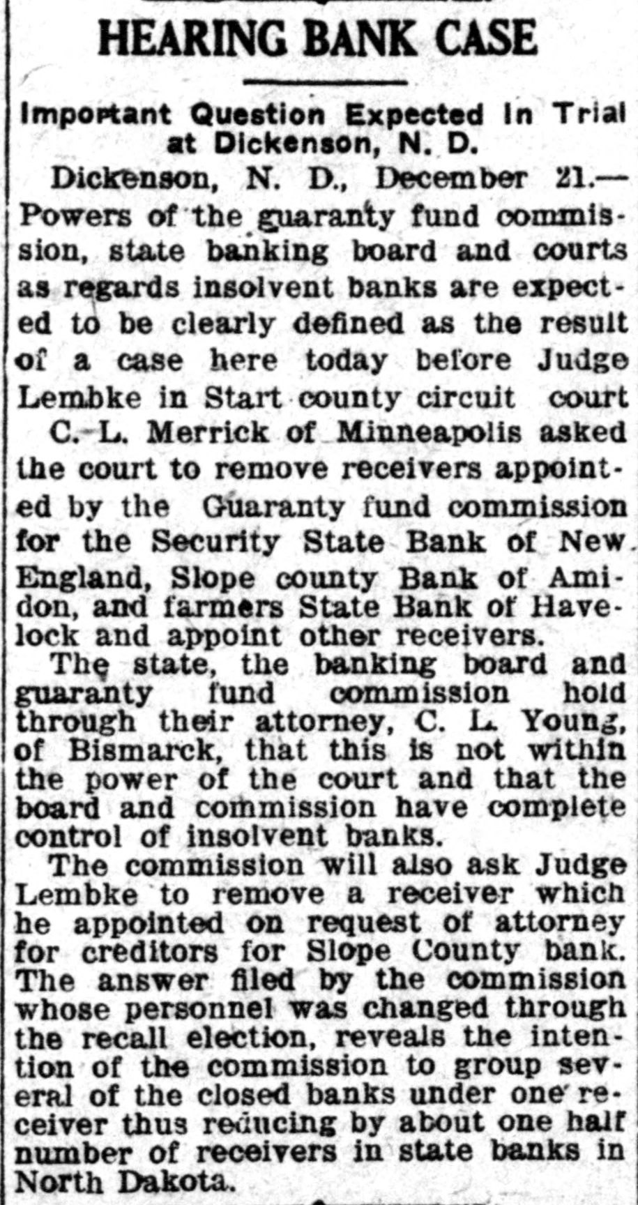 HEARING BANK CASE Important Question Expected In Trial at Dickenson, N. D. Dickenson, N. D., December 21.Powers of the guaranty fund commission, state banking board and courts as regards insolvent banks are expected to be clearly defined as the result of a case here today before Judge Lembke in Start county circuit court C.-L. Merrick of Minneapolis asked the court to remove receivers appointed by the Guaranty fund commission for the Security State Bank of New England, Slope county Bank of Amidon, and farmers State Bank of Havelock and appoint other receivers. The state, the banking board and guaranty fund commission hold through their attorney, C. L. Young, of Bismarck, that this is not within the power of the court and that the board and commission have complete control of insolvent banks. The commission will also ask Judge Lembke to remove a receiver which he appointed on request of attorney for creditors for Slope County bank. The answer filed by the commission whose personnel was changed through the recall election, reveals the intention of the commission to group several of the closed banks under one receiver thus reducing by about one half number of receivers in state banks in North Dakota.