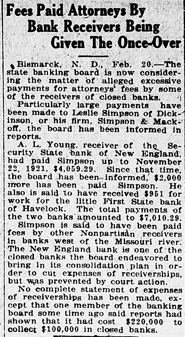 Fees Paid Attorneys By Bank Receivers Being Given The Once-Over Bismarck, N. D., Feb. 20.-The state banking board is now considering the matter of alleged excessive payments for attorneys' fees by some of the receivers of closed banks. 1 Particularly large payments have been made to Leslie Simpson of Dickinson. or his firm, Simpson & Mackoff, the board has been informed in reports. A. L. Young. receiver of the Security State bank of New England, had paid Simpson up to November 22, 1921. $4,059.29. Since that time, the board has been-informed, $2,000 more has been paid Simpson. He also is said to have received $951 for work for the little First State bank of Havelock. The total payments of the two banks amounted to $7,010.29. Simpson is said to have been paid fees by other Nonpartisan receivers in banks west of the Missouri river. The New England bank is one of the closed banks the board endeavored to bring in its consolidation plan in order to cut expenses of receiverships, but was prevented by court action. No complete statement of expenses of receiverships has been made, except that one member of the banking board some time ago said reports had shown that it had cost $220,000 to collect $100,000 in closed banks.