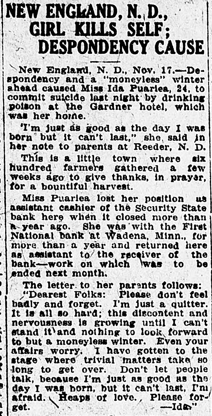 NEW ENGLAND, N.D., GIRL KILLS SELF; DESPONDENCY CAUSE New England, N. D., Nov. 17.-Despondency and a "moneyless" winter ahead caused Miss Ida Puariea, 24, to commit suicide last night by drinking poison at the Gardner hotel, which was her home. 'I'm just as good as the day I was born but it can't last," she, said in her note to parents at Reeder, N. D. This is a little town where six hundred farmers gathered a few weeks ago to give thanks, in prayer, for a bountiful harvest. Miss Puariea lost her position us assistant cashier of the Security State bank here when it closed more than n year ago. She was with the First National bank at Wadena, Minn., for more than a year and returned here as assistant to the receiver of the bank-work on which was to be ended next month. The letter to her parents follows: "Dearest Folks: Please don't feel badly and forget. I'm just a quitter. It is all so hard; this discontent and nervousness is growing until I can't stand it' and nothing to look forward to but a moneyless winter. Even your affairs worry. I have gotten to the stage where trivial matters take HO long to get over. Don't let people talk, because I'm just as good as the day I was horn, but it can't last, I'm afraid. Heaps of love. Please for-Ida" get.