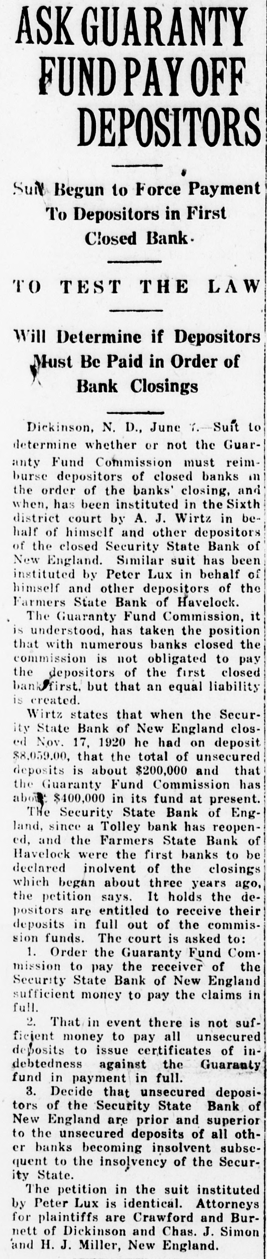 ASK GUARANTY FUND PAY OFF DEPOSITORS Suit Begun to Force Payment To Depositors in First Closed Bank TO TEST THE LAW Will Determine if Depositors Must Be Paid in Order of Bank Closings Dickinson, N. D., June T.-Suit to determine whether or not the Guaranty Fund Commission must reimburse depositors of closed banks ill the order of the banks' closing, and when, has been instituted in the Sixth district court by A. J. Wirtz in behalf of himself and other depositors of the closed Security State Bank of New England. Similar suit has been instituted by Peter Lux in behalf of himself and other depositors of the Farmers State Bank of Havelock. The Guaranty Fund Commission, it is understood, has taken the position that with numerous banks closed the commission is not obligated to pay the depositors of the first closed bank first. but that an equal liability is created. Wirtz states that when the Security State Bank of New England closed Nov. 17, 1920 he had on deposit $8,059.00, that the total of unsecured deposits is about $200,000 and that the Guaranty Fund Commission has about $400,000 in its fund at present. The Security State Bank of England, since a Tolley bank has reopened, and the Farmers State Bank of Havelock were the first banks to be declared inolvent of the closings which began about three years ago, the petition says. It holds the depositors are entitled to receive their deposits in full out of the commission funds. The court is asked to: 1. Order the Guaranty Fund Com. mission to pay the receiver of the Security State Bank of New England sufficient money to pay the claims in full. 2. That in event there is not sufficient money to pay all unsecured deposits to issue certificates of indebtedness against the Guaranty fund in payment in full. 3. Decide that unsecured depositors of the Security State Bank of New England are prior and superior to the unsecured deposits of all other banks becoming insolvent subsequent to the insolvency of the Security State. The petition in the suit instituted by Peter Lux is identical. Attorneys for plaintiffs are Crawford and Burnett of Dickinson and Chas. J. Simon and H. J. Miller, New England.