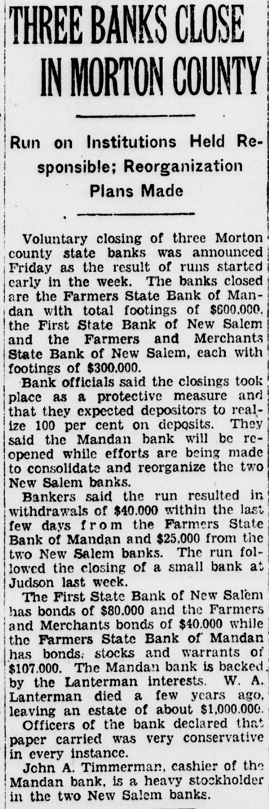 THREE BANKS CLOSE IN MORTON COUNTY Run on Institutions Held Responsible; Reorganization Plans Made Voluntary closing of three Morton county state banks was announced Friday as the result of runs started early in the week. The banks closed are the Farmers State Bank of Mandan with total footings of $600,000. the First State Bank of New Salem and the Farmers and Merchants State Bank of New Salem, each with footings of $300,000. Bank officials said the closings took place as a protective measure and that they expected depositors to realize 100 per cent on deposits. They said the Mandan bank will be reopened while efforts are being made to consolidate and reorganize the two New Salem banks. Bankers said the run resulted in withdrawals of $40.000 within the last few days from the Farmers State Bank of Mandan and $25,000 from the two New Salem banks. The run followed the closing of a small bank at Judson last week. The First State Bank of New Salem has bonds of $80,000 and the Farmers and Merchants bonds of $40.000 while the Farmers State Bank of Mandan has bonds. stocks and warrants of $107.000. The Mandan bank is backed by the Lanterman interests. W. A. Lanterman died a few years ago, leaving an estate of about $1,000.000. Officers of the bank declared that paper carried was very conservative in every instance. John A. Timmerman, cashier of the Mandan bank, is a heavy stockholder in the two New Salem banks.
