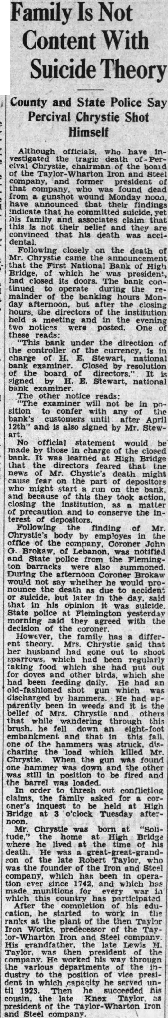 Family Is Not Content With Suicide Theory County and State Police Say Percival Chrystie Shot Himself Although officials, who have intragic chairman the board the Steel company, former president found dead gunshot Monday noon, that findings that associates claim this their belief they convinced that his death was accidental. Following closely on the death of the the First Bank High Bridge, its tinued operate during mainder the banking Monday afternoon, after the closing hours, directors the institution evening posted. One reads: bank under the direction the the charge Stewart, national bank examiner. Closed by resolution the board directors. signed Stewart, national other notice reads: be sition confer with any bank's customers after April 12th" and is also signed by Mr. Stewofficial statement would charge the closed bank. Bridge that the directors feared Mr. Chystie's death might cause on the of depositors might run and because this they action, closing matter and the indepositors. Following finding of Mr. Chrystie's body by employes the Coroner notified State from Flemington were During the Brokaw would not whether he would pronounce the death to accident later in the day, said his opinion was Flemington morning agreed with decision the family has differtheory. said husband gone out to shoot sparrows, which been regularly taking which other had been discharged hammers. had parently weeds and it belief Mrs. Chrystie and others wandering through brush. fell charing the load which killed Chrystie. the was found hammer down and the other still position be fired and the barrel was loaded. order conflicting claims, asked for oner's held High Bridge o'clock Tuesday afterChrystie born at High Bridge at death. late Taylor. the founder the Iron and company, which in operation since and which has made this country has After the his cation, started the ranks the plant of the Works, of the Tayand Steel company. His the then the the dustry position vice which capacity served 1923 Then succeeded nis the late Knox Taylor Iron and Steel