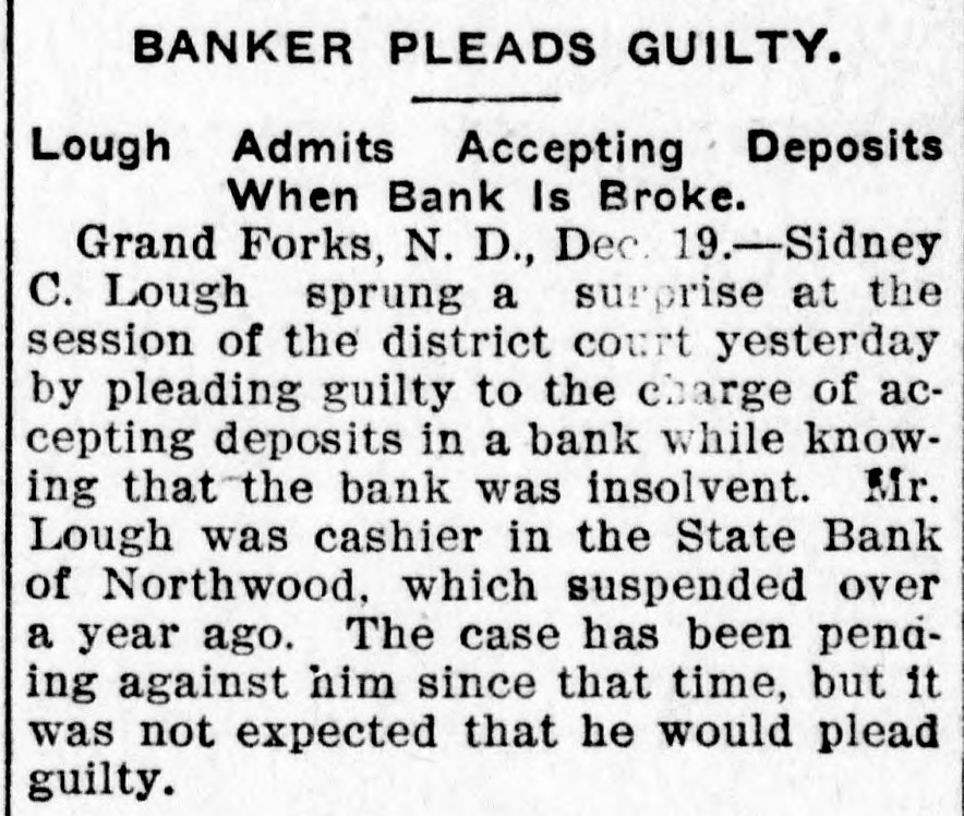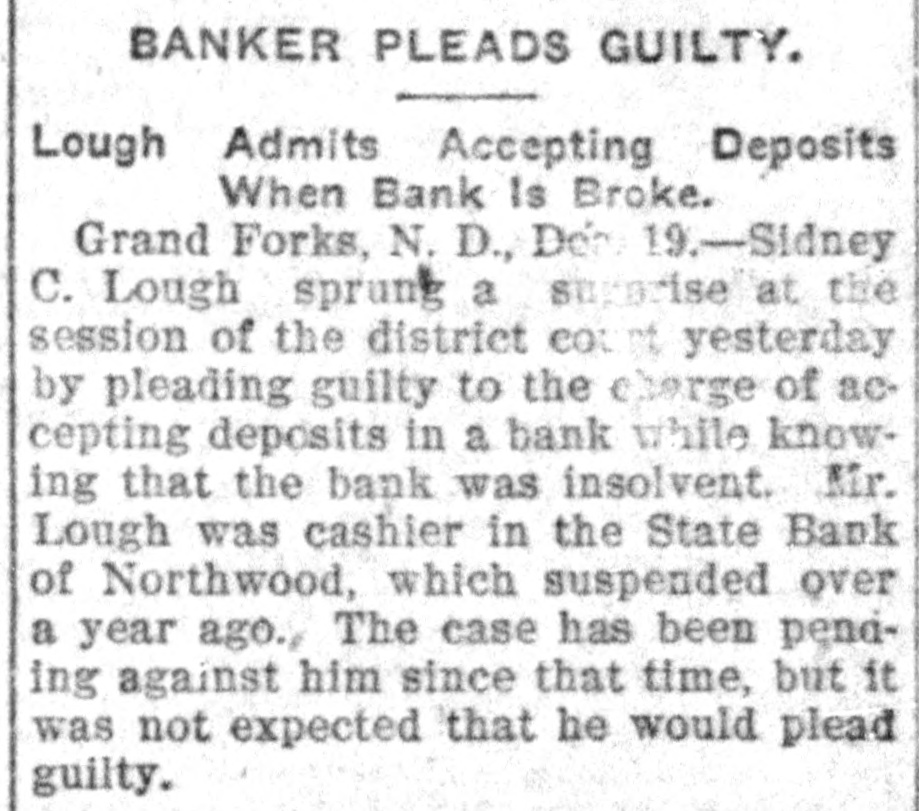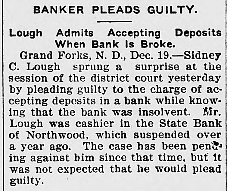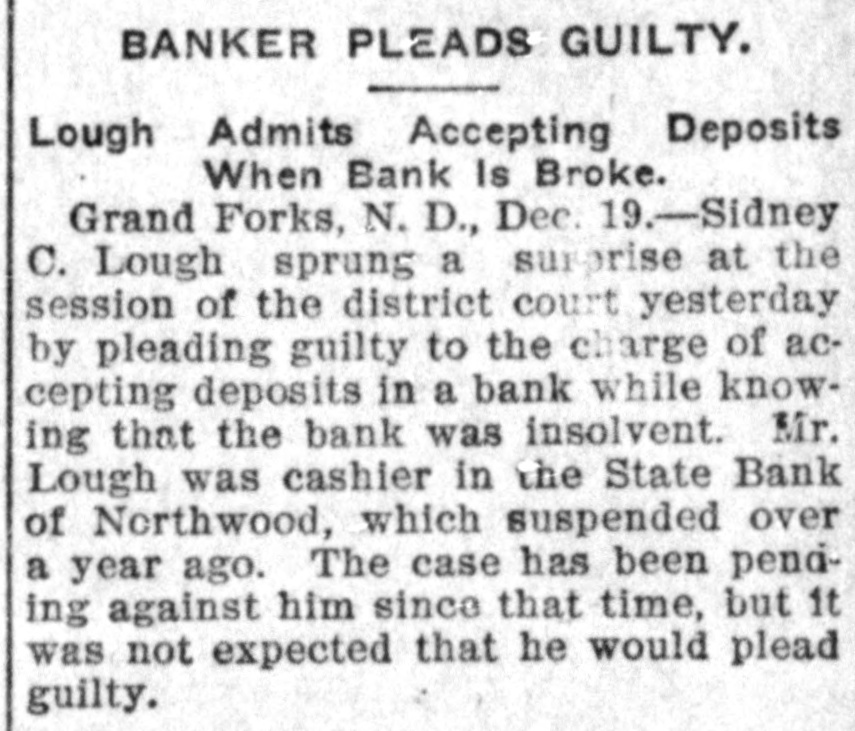 BANKER PLEADS GUILTY. Lough Admits Accepting Deposits When Bank Is Broke. Grand Forks, N. D., De 19.-Sidney C. Lough sprung a surarise at the session of the district count yesterday by pleading guilty to the charge of accepting deposits in a bank while knowing that the bank was insolvent. Mr. Lough was cashier in the State Bank of Northwood, which suspended over a year ago., The case has been pending against him since that time, but it was not expected that he would plead guilty.