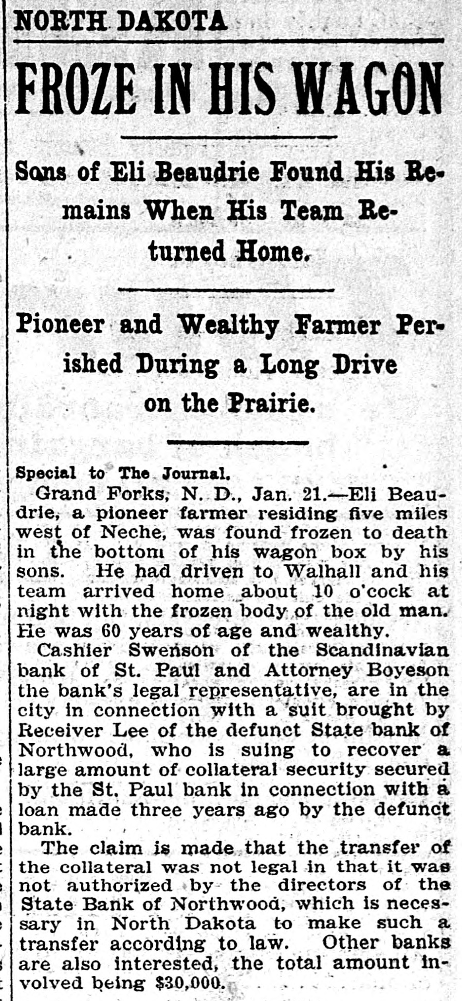 NORTH DAKOTA # FROZE IN HIS WAGON Sons of Eli Beaudrie Found His Remains When His Team Returned Home. # Pioneer and Wealthy Farmer Perished During a Long Drive on the Prairie. Special to The Journal. Grand Forks, N. D., Jan. 21.-Eli Beaudrie, a pioneer farmer residing five miles west of Neche, was found frozen to death in the bottom of his wagon box by his sons. He had driven to Walhall and his team arrived home about 10 o'cock at night with the frozen body of the old man. He was 60 years of age and wealthy. Cashier Swenson of the Scandinavian bank of St. Paul and Attorney Boyeson the bank's legal representative, are in the city in connection with a suit brought by Receiver Lee of the defunct State bank of Northwood, who is suing to recover a large amount of collateral security secured by the St. Paul bank in connection with a loan made three years ago by the defunct bank. The claim is made that the transfer of the collateral was not legal in that it was not authorized by the directors of the State Bank of Northwood, which is necessary in North Dakota to make such a transfer according to law. Other banks are also interested, the total amount involved being $30,000.