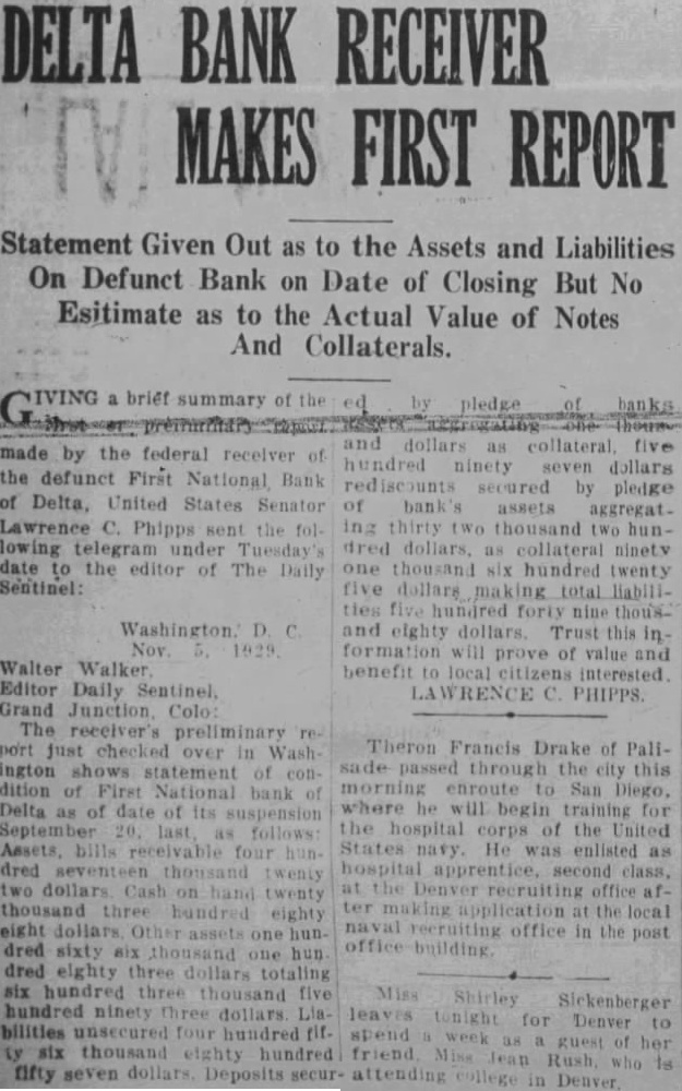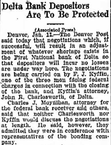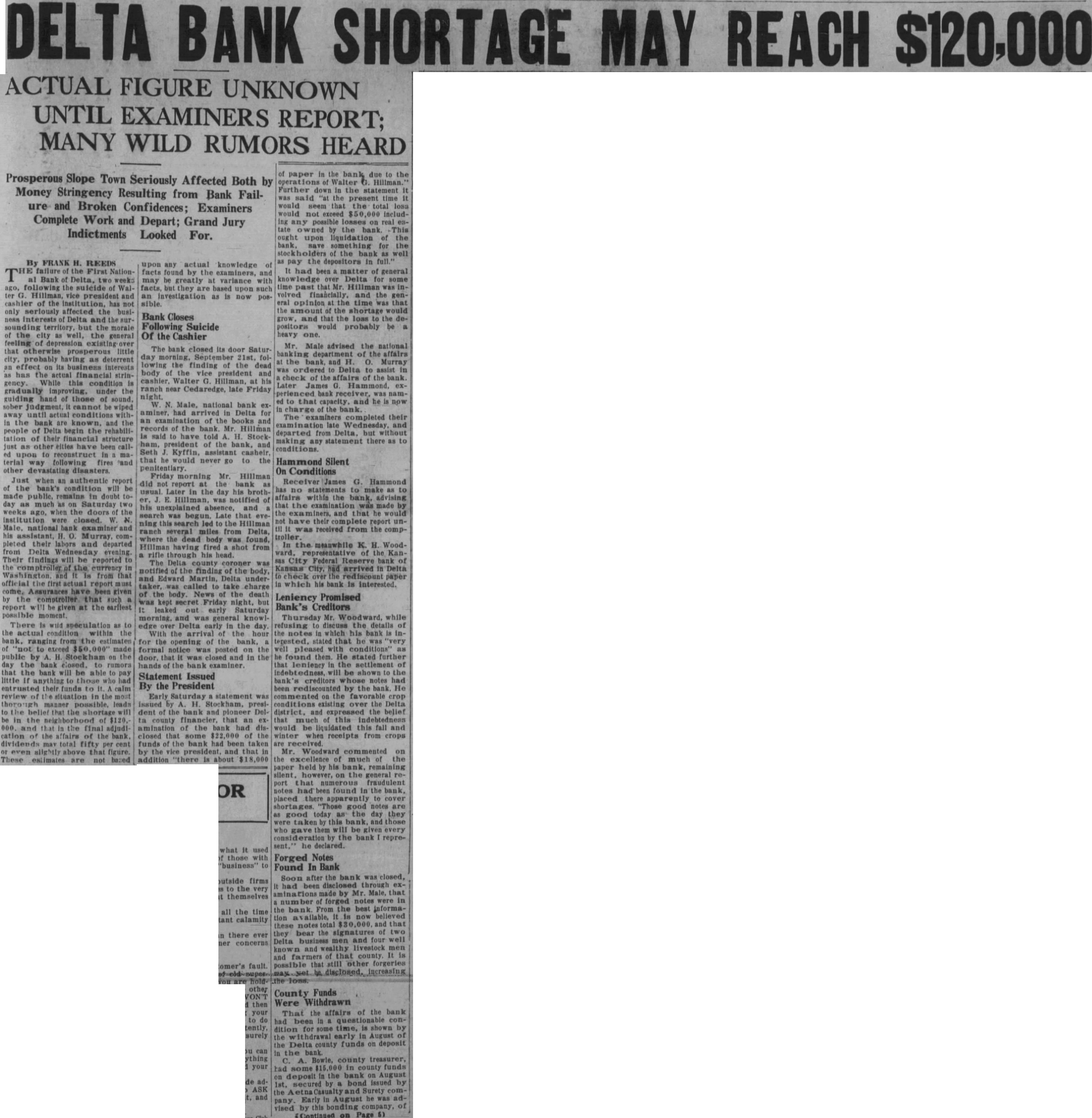 By FRANK H. REEDS failure of the First National Bank of Delta, two weeks ago, following the suicide of Walter Hillman, vice president and cashier of the has not only seriously affected the business interests Delta and the sursounding territory, but the morale of the city as well, the general feeling of depression existing over that otherwise prosperous little city, probably having as deterrent effect on its business interests has the actual financial stringency. While this condition is gradually improving, under the guiding hand of those of sound. sober judgment, cannot be wiped away until actual within the bank are known, and the people of Delta begin the rehabilitation of their financial structure just as other eities have been called upon to reconstruct in material way following fires *and other devastating disasters. Just when an authentic report the bank's condition will be made public, remains in doubt today as much as on Saturday two weeks ago, when the doors of the Institution were closed. W. N. Male, national bank examiner and his assistant, Murray, completed their labors and departed from Delta Wednesday evening. Their findings will be reported to the of the currency in Washington and is from that official the first actual report must come, Assurances have been given by the comptroller that such report be given at the earliest possible moment. There is wild speculation as to the actual condition within the bank. ranging from the estimates of "not to exceed made public by Stockham on the day the bank closed. to rumors that the bank will be able to pay little If anything to those who had their funds to calm review of the situation in the most thorough manner possible, leads the belief that the shortage will be in the neighborhood of $120.000. and that in the final adjudication of the affairs of the bank. dividends may total fifty per cent even alightly above that figure. These estimates are not based upon any actual knowledge of facts found by the examiners, and may be greatly at variance with facts, but they are based upon such an investigation as is now possible.