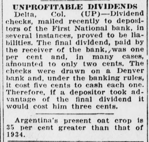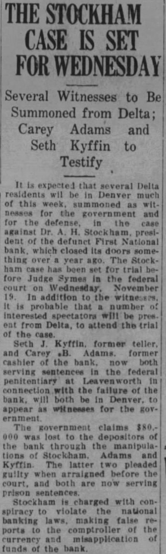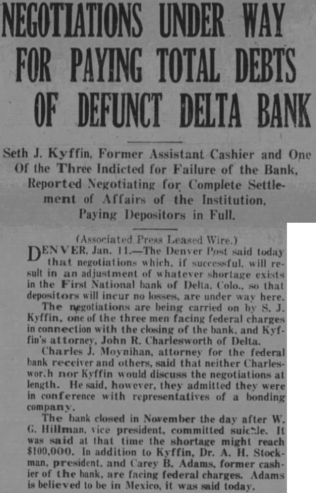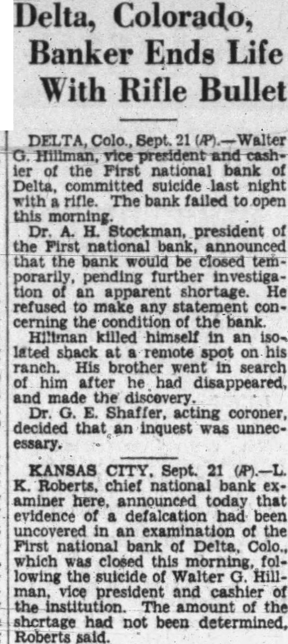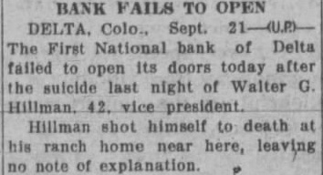 The bank closed Its door Saturday morning. September 21st, following the finding of the dead body the vice president and cashier, Walter G. Hillman, at his ranch near Cedaredge, late Friday night. N. Male, national bank examiner, had arrived in Delta for an examination of the books and records of the bank. Mr. Hillman is said to have told A. H. Stockham, president of the bank, and Seth Kyffin, assistant casheir. that he would never go to the Friday morning Mr. Hillman did not report at the bank as usual. Later in the day his brother. E. Hillman, was notified of his absence, and search was begun. Late that evening this search led to the Hillman ranch several miles from Delta, where the dead body was found, Hillman having fired shot from rifle through his head. The Delta county coroner was notified of the finding of the body. and Edward Martin, Delta undertaker, was called to take charge of the body News of the death was kept secret Friday night. but It leaked out early Saturday morning. and was general knowledge over Delta early in the day. With the arrival of the hour for the opening of the bank, formal notice was posted on the door, that it was closed and in the hands of the bank examiner. Statement Issued By the President