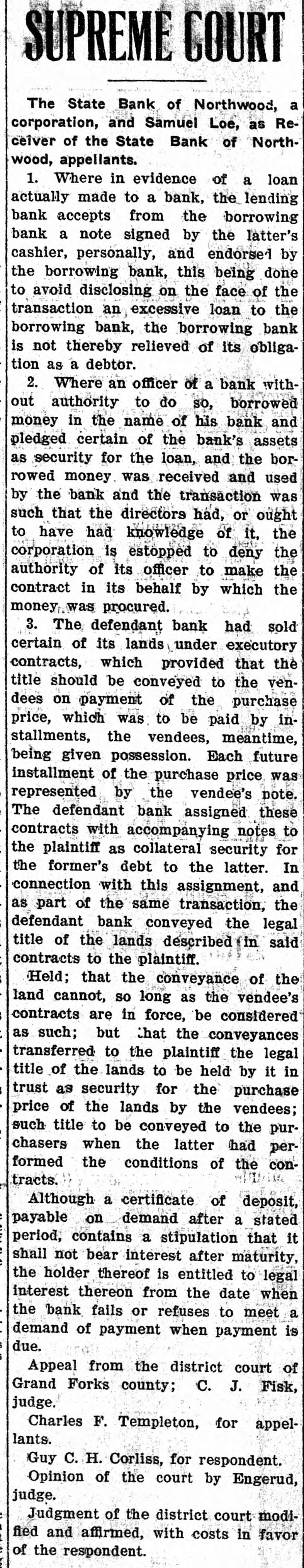 SUPREME COURT The State Bank of Northwood, a corporation, and Samuel Loe, as Receiver of the State Bank of Northwood, appellants. 1. Where in evidence of a loan actually made to a bank, the lending bank accepts from the borrowing bank a note signed by the latter's cashier, personally, and endorsed by the borrowing bank, this being done to avoid disclosing on the face of the transaction an excessive loan to the borrowing bank, the borrowing bank is not thereby relieved of its obligation as a debtor. 2. Where an officer of a bank without authority to do so, borrowed money in the name of his bank and pledged certain of the bank's assets as security for the loan, and the borrowed money was received and used by the bank and the transaction was such that the directors had, or ought to have had knowledge of it, the corporation is estopped to deny the authority of its officer to make the contract in its behalf by which the money was procured. 3. The defendant bank had sold certain of its lands under executory contracts, which provided that the title should be conveyed to the vendees on payment of the purchase price, which was to be paid by installments, the vendees, meantime, being given possession. Each future installment of the purchase price was represented by the vendee's note. The defendant bank assigned these contracts with accompanying notes to the plaintiff as collateral security for the former's debt to the latter. In connection with this assignment, and as part of the same transaction, the defendant bank conveyed the legal title of the lands described (in said contracts to the plaintiff. Held; that the conveyance of the land cannot, so long as the vendee's contracts are in force, be considered as such; but that the conveyances transferred to the plaintiff the legal title of the lands to be held by it in trust as security for the purchase price of the lands by the vendees; such title to be conveyed to the purchasers when the latter had performed the conditions of the contracts. Although a certificate of deposit, payable on demand after a stated period, contains a stipulation that it shall not bear interest after maturity, the holder thereof is entitled to legal interest thereon from the date when the bank fails or refuses to meet a demand of payment when payment is due. Appeal from the district court of Grand Forks county; C. J. Fisk, judge. Charles F. Templeton, for appellants. Guy C. H. Corliss, for respondent. Opinion of the court by Engerud, judge. Judgment of the district court modified and affirmed, with costs in favor of the respondent.