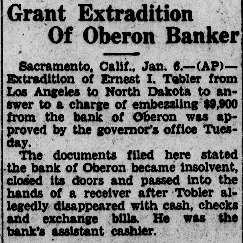 Grant Extradition Of Oberon Banker Sacramento, Calif., Jan. 6.-(AP)Extradition of Ernest I. Tebler from Los Angeles to North Dakota to answer to a charge of embezzling $9,900 from the bank of Oberon was approved by the governor's office Tuesday. The documents filed here stated the bank of Oberon became insolvent, closed its doors and passed into the hands of a receiver after Tobler allegedly disappeared with cash, checks and exchange bills. He was the bank's assistant cashier.