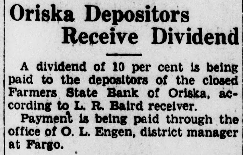 Oriska Depositors Receive Dividend A dividend of 10 per cent is being paid to the depositors of the closed Farmers State Bank of Oriska, according to L. R. Baird receiver. Payment is being paid through the office of O. L. Engen, district manager at Fargo.