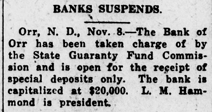 BANKS SUSPENDS. Orr, N. D., Nov. 8.-The Bank of Orr has been taken charge of by the State Guaranty Fund Commission and is open for the receipt of special deposits only. The bank is capitalized at $20,000. L. M. Hammond is president.