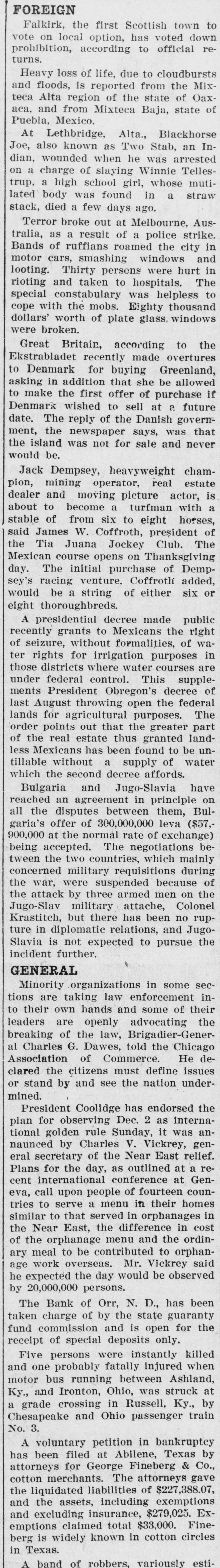 FOREIGN Falkirk, the first Scottish town to vote on local option, has voted down prohibition, according to official returns. Heavy loss of life, due to cloudbursts and floods, is reported from the Mixteca Alta region of the state of Oaxaca, and from Mixteca Baja, state of Puebla, Mexico. At Lethbridge, Alta., Blackhorse Joe, also known as Two Stab, an Indian, wounded when he was arrested on a charge of slaying Winnie Tellestrup, a high school girl, whose mutilated body was found in a straw stack, died a few days ago. Terror broke out at Melbourne, Australia, as a result of a police strike. Bands of ruffians roamed the city in motor cars, smashing windows and looting. Thirty persons were hurt in rioting and taken to hospitals. The special constabulary was helpless to cope with the mobs. Eighty thousand dollars' worth of plate glass. windows were broken. Great Britair, according to the Ekstrabladet recently made overtures to Denmark for buying Greenland, asking in addition that she be allowed to make the first offer of purchase if Denmark wished to sell at a future date. The reply of the Danish government, the newspaper says, was that the island was not for sale and never would be. Jack Dempsey, heavyweight champion, mining operator, real estate dealer and moving picture actor, is about to become a turfman with a stable of from six to eight horses, said James W. Coffroth, president of the Tia Juana Jockey Club. The Mexican course opens on Thanksgiving day. The initial purchase of Dempsey's racing venture, Coffroth added, would be a string of either six or eight thoroughbreds. A presidential decree made public recently grants to Mexicans the right of seizure, without formalities, of water rights for irrigation purposes in those districts where water courses are under federal control. This supplements President Obregon's decree of last August throwing open the federal for purposes. order out that the part lands points agricultural greater The of the real estate thus granted landless Mexicans has been found to be untillable without a supply of water which the second decree affords. Bulgaria and Jugo-Slavia have reached an agreement in principle on all the disputes between them, Bulgaria's offer of 300,000,000 leva ($57, at the normal rate exchange) The two 900,000 being tween accepted. the countries, negotiations which of mainly bewere suspended of concerned the war, military requisitions because during the three armed men on military but there has no rupKrastitch, Jugo-Slav the attack by attache, been and Colonel ture in diplomatic relations, JugoSlavia is not expected to pursue the incident further. GENERAL Minority organizations in some sections are taking law enforcement into their own hands and some of their are openly advocating the of the law, al G. Dawes, told breaking leaders Charles Brigadier-Gener- the Chicago Association of Commerce. He declared the citizens must define issues or stand by and see the nation undermined. President Coolidge has endorsed the plan for observing Dec. 2 as international golden rule Sunday, it was annaunced by Charles V. Vickrey, genof the the as a reeral Plans secretary for day, Near outlined East at relief. conference at Genpeople of serve a menu in eva, cent tries call international to upon fourteen their homes counto that served in in the cost similar the Near East, difference and orphanages the in ordinof the orphanage menu meal to be to work overseas. Mr. ary age contributed Vickrey orphan- said he expected the day would be observed by 20,000,000 persons. The Bank of Orr, N. D., has been taken of by the state charge guaranty for the fund commission and is open receipt of special deposits only. Five persons were instantly killed one probably fatally injured when running between Ohio, was at and motor Ky., and bus Ironton, struck Ashland, a grade crossing in Russell, Ky., by Chesapeake and Ohio passenger train No. 3. A voluntary petition in bankruptcy been filed at Abilene, Texas by for George Co., merchants. The gave attorneys has cotton Fineberg attorneys $227,388.07, & the liquidated liabilities of assets, including insurance, and and excluding the $33,000. $279,025. exemptions Fine- Exemptions claimed total berg is widely known in cotton circles in Texas. A band of robbers, variously esti-