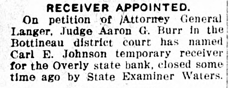 RECEIVER APPOINTED. On petition of /Attorney General Langer, Judge Aaron G. Burr in the Bottineau district court has named Carl E. Johnson temporary receiver for the Overly state bank, closed some time ago by State Examiner Waters.