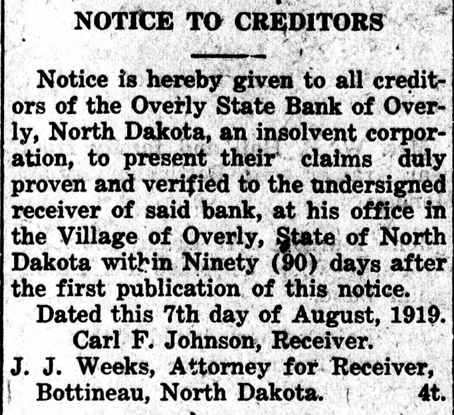NOTICE TO CREDITORS Notice is hereby given to all creditors of the Overly State Bank of Overly, North Dakota, an insolvent corporation, to present their claims duly proven and verified to the undersigned receiver of said bank, at his office in the Village of Overly,-State of North Dakota within Ninety (90) days after the first publication of this notice. Dated this 7th day of August, 1919. Carl F. Johnson, Receiver. J.J. Weeks, Attorney for Receiver, 4t. Bottineau, North Dakota.
