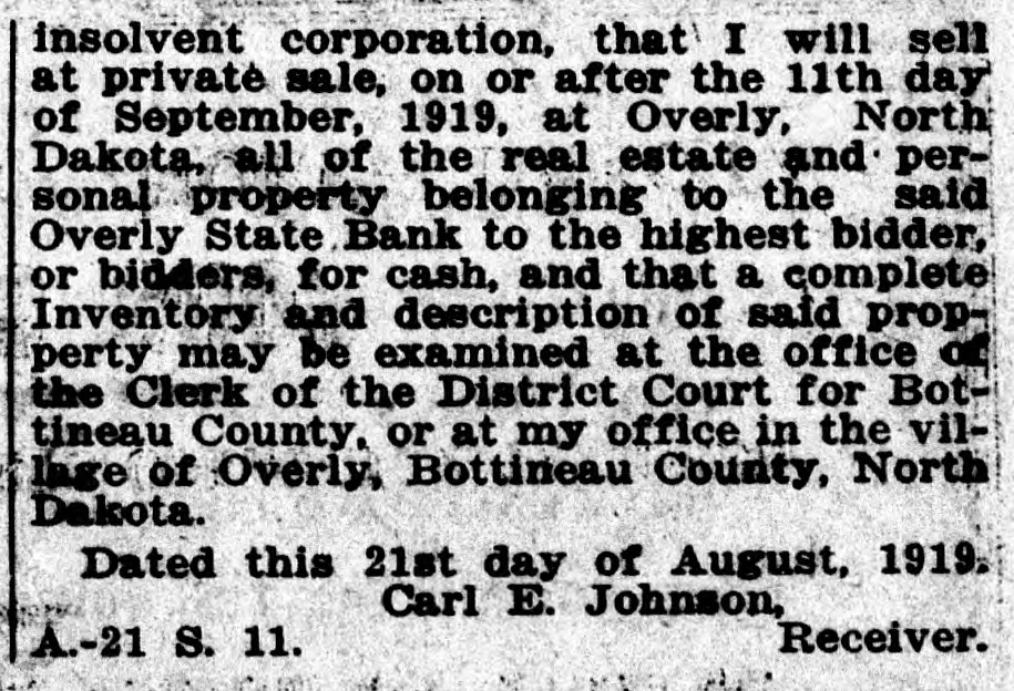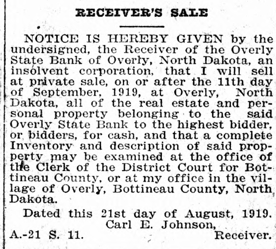 RECEIVER'S SALE NOTICE IS HEREBY GIVEN by the undersigned, the Receiver of the Overly State Bank of Overly, North Dakota, an insolvent corporation, that I will sell at private sale, on or after the 11th day of September, 1919, at Overly, North Dakota, all of the real estate and personal property belonging to the said Overly State Bank to the highest bidder, or bidders, for cash, and that a complete Inventory and description of said propperty may be examined at the office of the Clerk of the District Court for Bottineau County, or at my office in the village of Overly, Bottineau County, North Dakota. Dated this 21st day of August, 1919. Carl E. Johnson, A.-21 S. 11. Receiver.