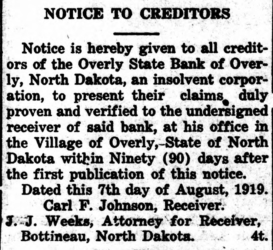 NOTICE TO CREDITORS Notice is hereby given to all creditors of the Overly State Bank of Overly, North Dakota, an insolvent corporation, to present their claims duly proven and verified to the undersigned receiver of said bank, at his office in the Village of Overly, State of North Dakota within Ninety (90) days after the first publication of this notice. Dated this 7th day of August, 1919. Carl F. Johnson, Receiver. J. J. Weeks, Attorney for Receiver, 4t. Bottineau, North Dakota.