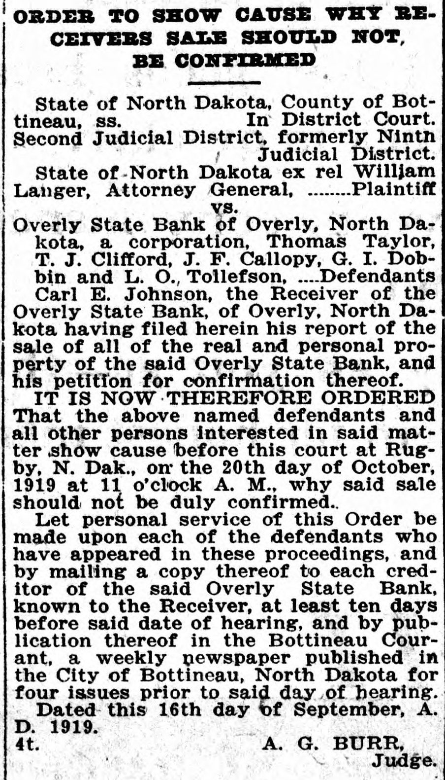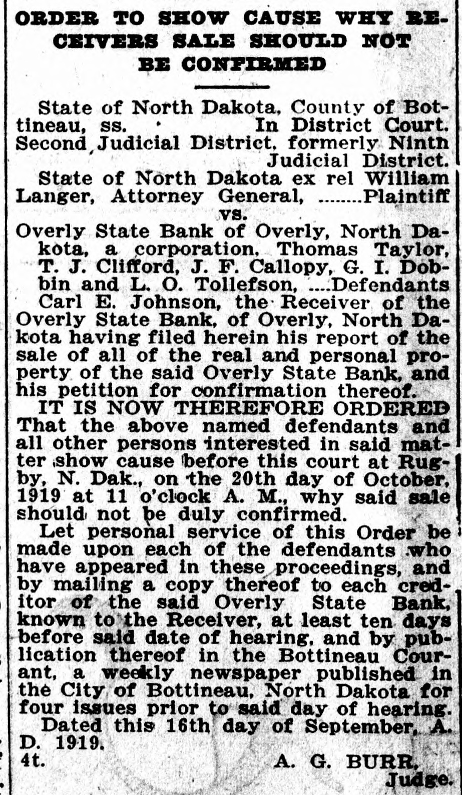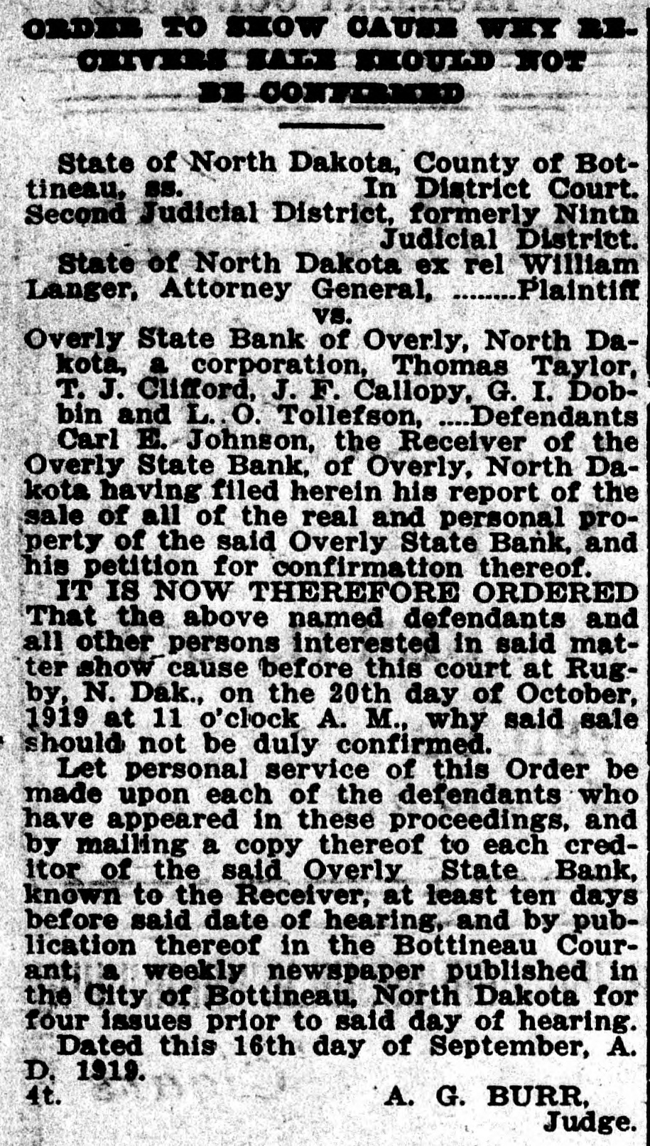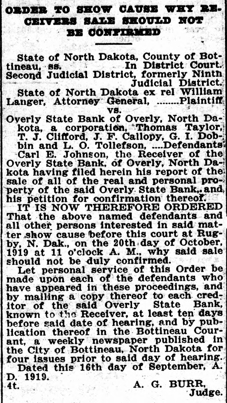 TO SKOW CAUSE WHY RESHOULD NOT BE-CONFERMED State of North Dakota, County of BotIn District Court. tineau, SS. Second Judicial District, formerly Ninth Judicial District. State of North Dakota ex rel William Plaintiff Langer, Attorney General, vs. Overly State Bank of Overly, North Dakota, a corporation, Thomas Taylor, T. J. Clifford, J. F. Callopy, G. I. Dobbin and L. O. Tollefson, Defendants Carl E. Johnson, the Receiver of the Overly State Bank, of Overly, North Dakota having filed herein his report of the sale of all of the real and personal property of the said Overly State Bank, and his petition for confirmation thereof. IT IS NOW THEREFORE ORDERED That the above named defendants and all other persons interested in said matter show cause before this court at Rugby, N. Dak., on the 20th day of October, 1919 at 11 o'clock A. M., why said sale should not be duly confirmed. Let personal service of this Order be made upon each of the defendants who have appeared in these proceedings, and by mailing a copy thereof to each creditor of the said Overly State Bank, known to the Receiver, at least ten days before said date of hearing, and by publication thereof in the Bottineau Courant, a weekly newspaper published in the City of Bottineau, North Dakota for four issues prior to said day of hearing. Dated this 16th day of September, A. D. 1919. 4t. A. G. BURR, Judge.
