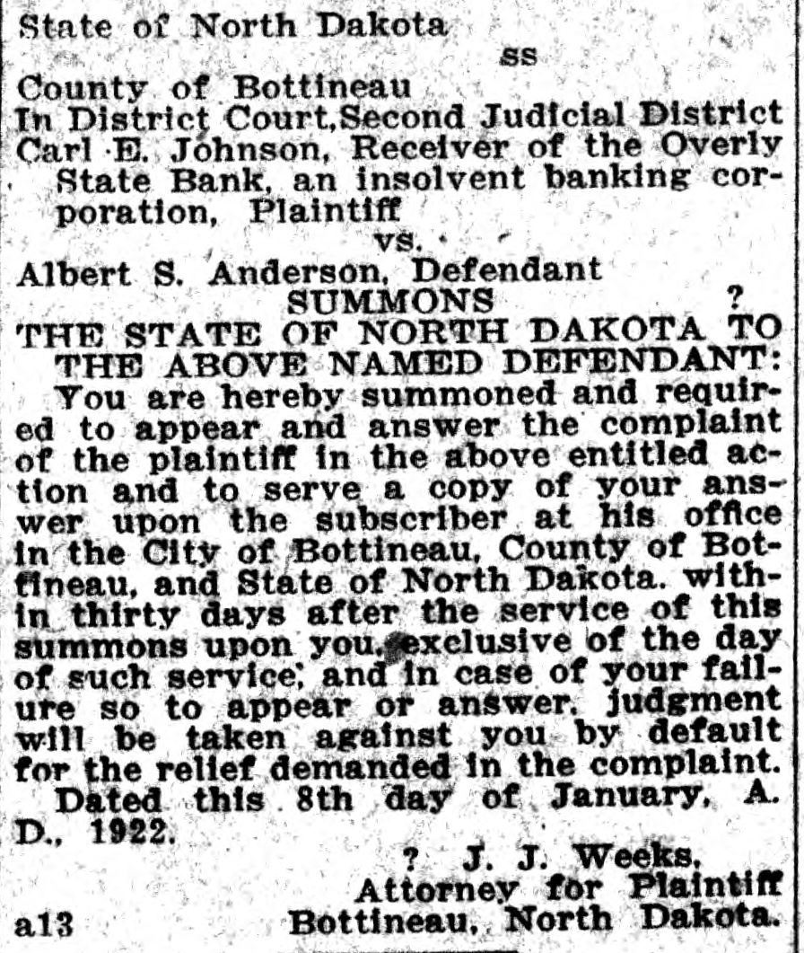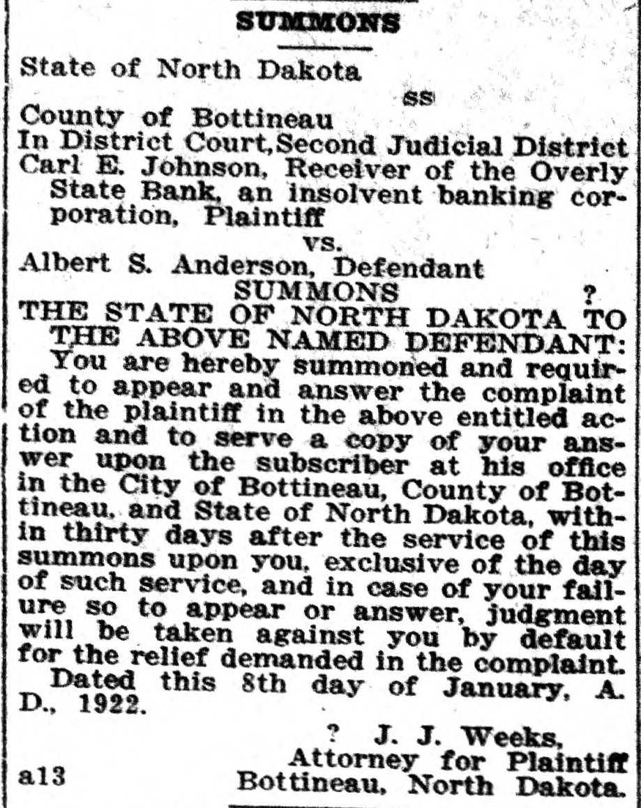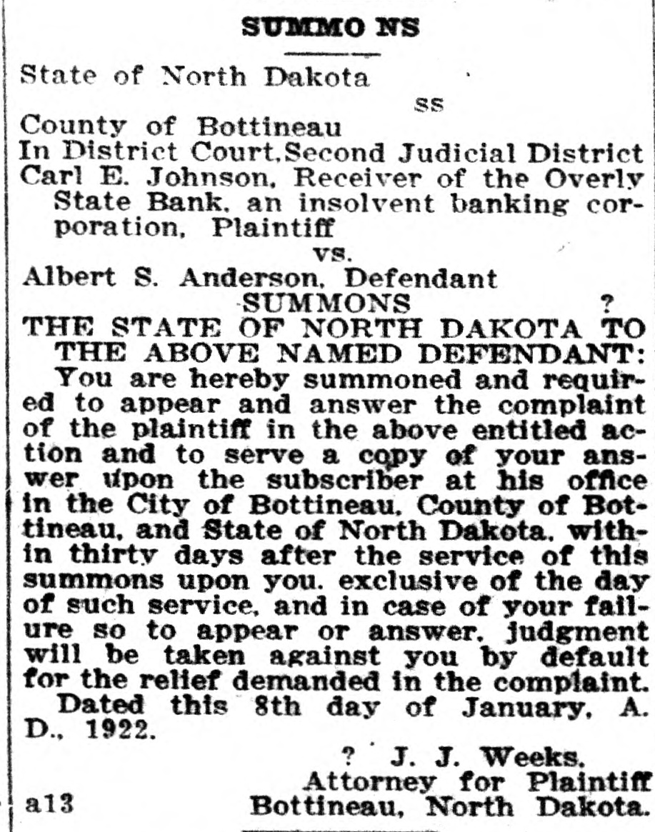 State of North Dakota SS County of Bottineau In District Court, Second Judicial District Carl E. Johnson, Receiver of the Overly State Bank, an insolvent banking corporation, Plaintiff vs. Albert S. Anderson, Defendant ? SUMMONS THE STATE OF NORTH DAKOTA TO THE ABOVE NAMED DEFENDANT: You are hereby summoned and required to appear and answer the complaint of the plaintiff in the above entitled action and to serve a copy of your answer upon the subscriber at his office in the City of Bottineau, County of Botfineau, and State of North Dakota. within thirty days after the service of this summons upon you. exclusive of the day of such service; and in case of your failure so to appear or answer. judgment will be taken against you by default for the relief demanded in the complaint. Dated this 8th day of January, A. D., 1922. ? J. J. Weeks. Attorney for Plaintiff Bottineau, North Dakota. a13
