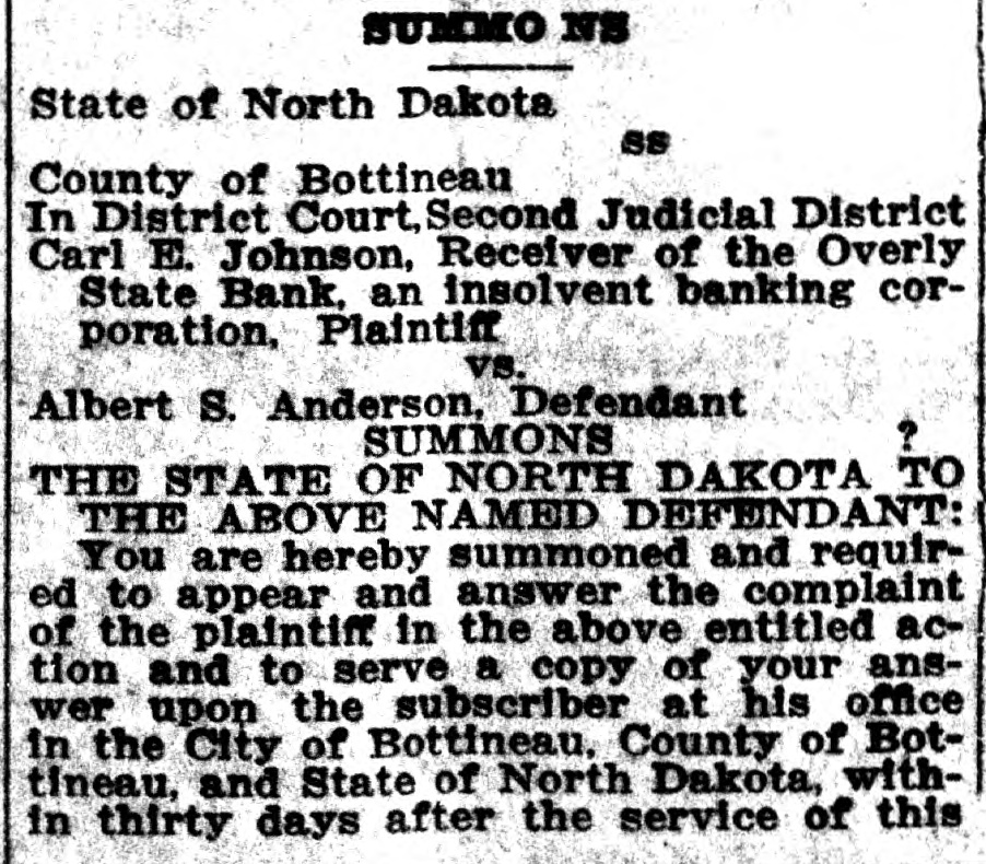 to NS State of North Dakota SS County of Bottineau In District Court, Second Judicial District Carl E. Johnson, Receiver of the Overly State Bank, an insolvent banking corporation, Plaintiff vs. Albert S. Anderson, Defendant ? SUMMONS THE STATE OF NORTH DAKOTA TO THE ABOVE NAMED DEFENDANT: You are hereby summoned and required to appear and answer the complaint of the plaintiff in the above entitled action and to serve a copy of your answer upon the subscriber at his office in the City of Bottineau, County of Bottineau, and State of North Dakota, within thirty days after the service of this