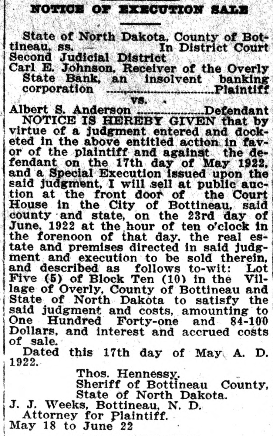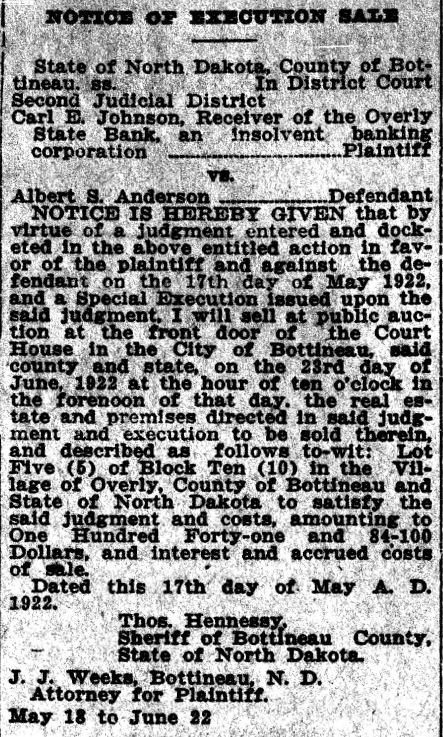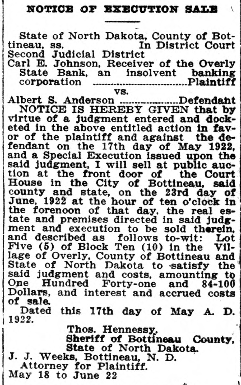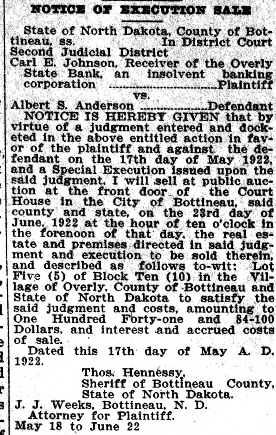 NOTICE OF EXECUTION SALE State of North Dakota, County of Bottineau. SS. In District Court Second Judicial District Carl E. Johnson, Receiver of the Overly State Bank, an insolvent banking Plaintiff corporation vs. Defendant Albert S. Anderson NOTICE IS HEREBY GIVEN that by virtue of a judgment entered and docketed in the above entitled action in favor of the plaintiff and against the defendant on the 17th day of May 1922, and a Special Execution issued upon the said judgment, I will sell at public auction at the front door of the Court House in the City of Bottineau, said county and state, on the 23rd day of June, 1922 at the hour of ten o'clock in the forenoon of that day. the real estate and premises directed in said judgment and execution to be sold therein, and described as follows to-wit: Lot Five (5) of Block Ten (10) in the Village of Overly, County of Bottineau and State of North Dakota to satisfy the said judgment and costs, amounting to One Hundred Forty-one and 84-100 Dollars, and interest and accrued costs of sale. Dated this 17th day of May A. D. 1922. Thos. Hennessy. Sheriff of Bottineau County, State of North Dakota. J. J. Weeks, Bottineau, N. D. Attorney for Plaintiff. May 18 to June 22