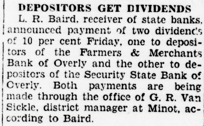 DEPOSITORS GET DIVIDENDS L. R. Baird. receiver of state banks. announced payment of two dividends of 10 per cent Friday, one to depositors of the Farmers & Merchants Bank of Overly and the other to depositors of the Security State Bank of Overly. Both payments are being made through the office of G. R. Van Sickle, district manager at Minot, according to Baird.