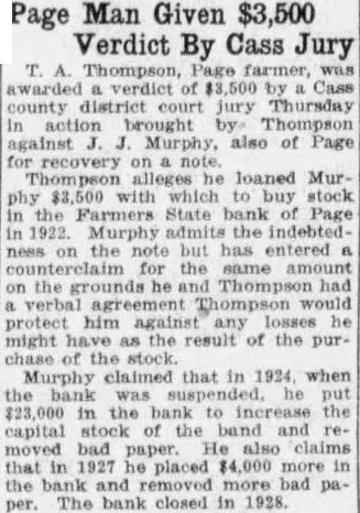 Page Man Given $3,500 Verdict By Cass Jury Thompson Page farmer, was awarded verdict of 500 by Cass county district court jury Thursday in action brought by Thompson against J. Murphy, also of Page for recovery on note alleges he loaned Murphy $3,500 with which buy stock in the Farmers State bank of Page in 1922. Murphy admits the indebted ness on the note but has entered a counterclaim for the same amount on the grounds he and Thompson had a verbal agreement Thompson protect him against any losses he might as the result of the pur. of the stock Murphy claimed that in 1924 when the bank was he put $23,000 in the bank to increase the capital stock of the band and re. moved bad paper. He also claims that in 1927 he placed $4,000 more in the bank and removed more bad paper. The bank closed in 1928.