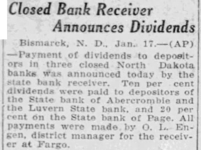 Closed Bank Receiver Announces Dividends -Payment of dividends to depositors in three closed North Dakota banks was announced today by the state bank receiver Ten per cent dividends were paid to depositors of the State bank of Abercrombie and the Luvern State bank. and 20 per cent on the State bank of Page All payments were made by O. Engen, district manager for the receiver at Fargo.