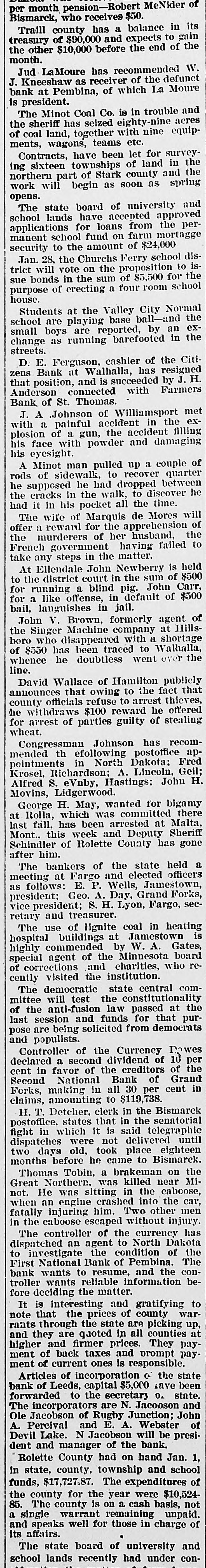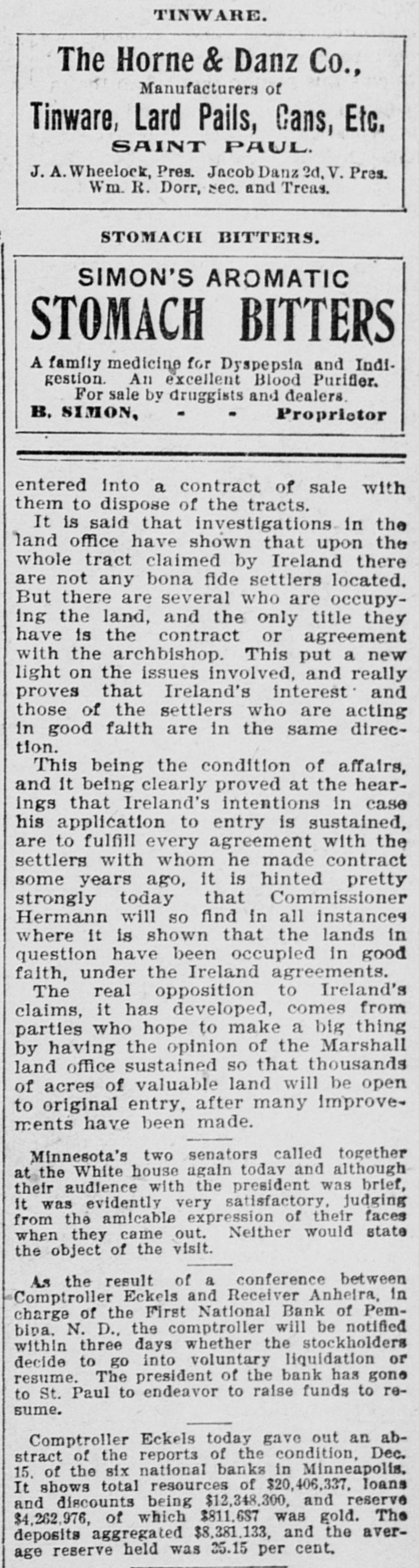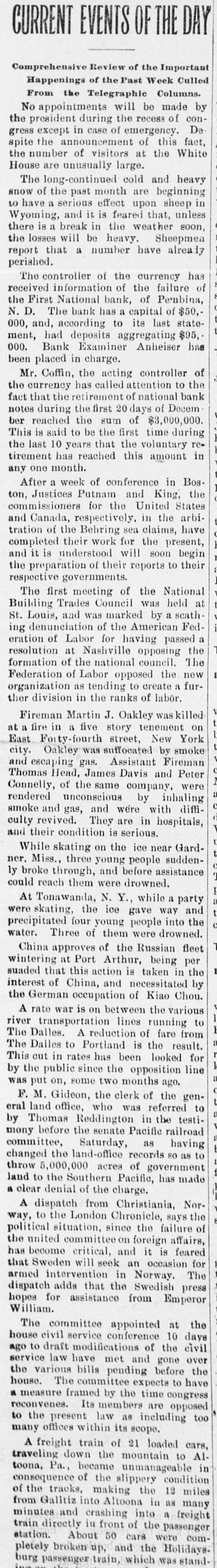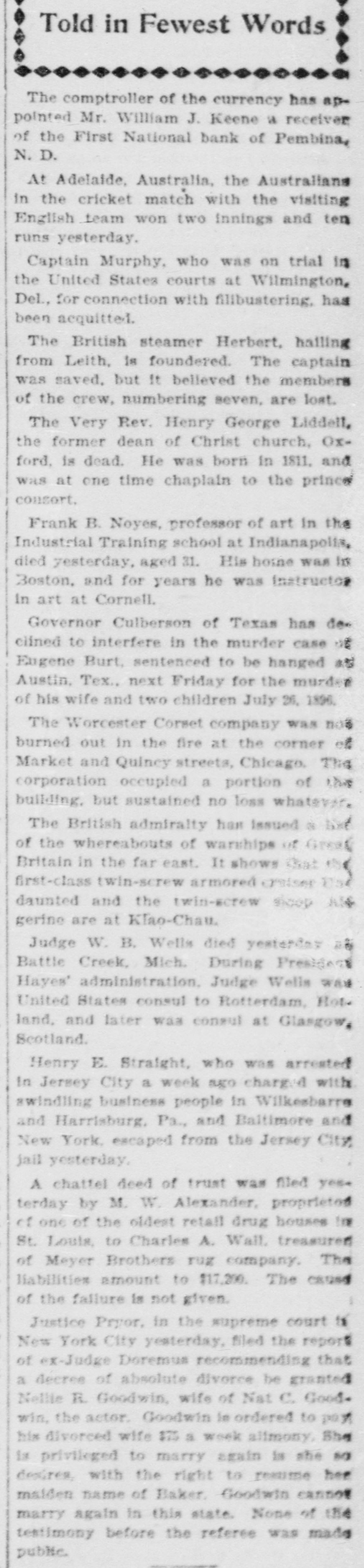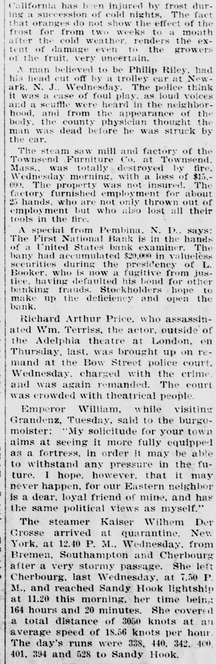 by a troney car at Newark. N. J., Wednesday. The police think it was a case of foul play. as loud voices and a scuffle were heard in the neighborhood. and from the appearance of the body. the county physician thought the man was dead before he was struck by the car. The steam saw mill and factory of the Townsend Furniture Co. at Townsend. Mass., was totally destroyed by fire, Wednesday morning. with a loss of $15.000. The property was not insured. The factory furnished employment for about 25 hands. who are not only thrown out of employment but who also lost all their tools in the fire. A special from Pembina, N. D., says: The First National Bank is in the hands of a United States bank examiner. The bany had accumulated $20,000 in valueless securities during the presidency of L. Booker. who is now a fugitive from justice. having defaulted his bond for other banking frauds. Stockholders hope to make up the deficiency and open the bank. Richard Arthur Price, who assassinated Wm. Terriss, the actor. outside of the Adelphia theatre at London, on Thursday, last, was brought up on remand at the Bow Street police court. Wednesday. charged with the crime, and was again remanded. The court was crowded with theatrical people. Emperor William, while visiting Grandenz, Tuesday, said to the burgomoister: "My solicitude for your town aims at seeing it more fully equipped as a fortress, in order it may be able to withstand any pressure in the future. I hope, however. that it may never happen, for our Eastern neighbor is a dear. loyal friend of mine, and has the same political views as myself." The steamer Kaiser Wilhem Der Grosse arrived at quarantine, New York, at 12.40 P. M., Wednesday. from Bremen, Southampton and Cherbourg after a very stormy passage. She left Cherbourg. last Wednesday. at 7.50 P. M., and reached Sandy Hook lightship at 11.20 this morning, her time being 164 hours and 20 minutes. She covered a total distance of 3050 knots at an average speed of 18.56 knots per hour. The day's runs were 338, 440, 342, 400, 401, 394 and 528 to Sandy Hook.