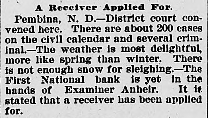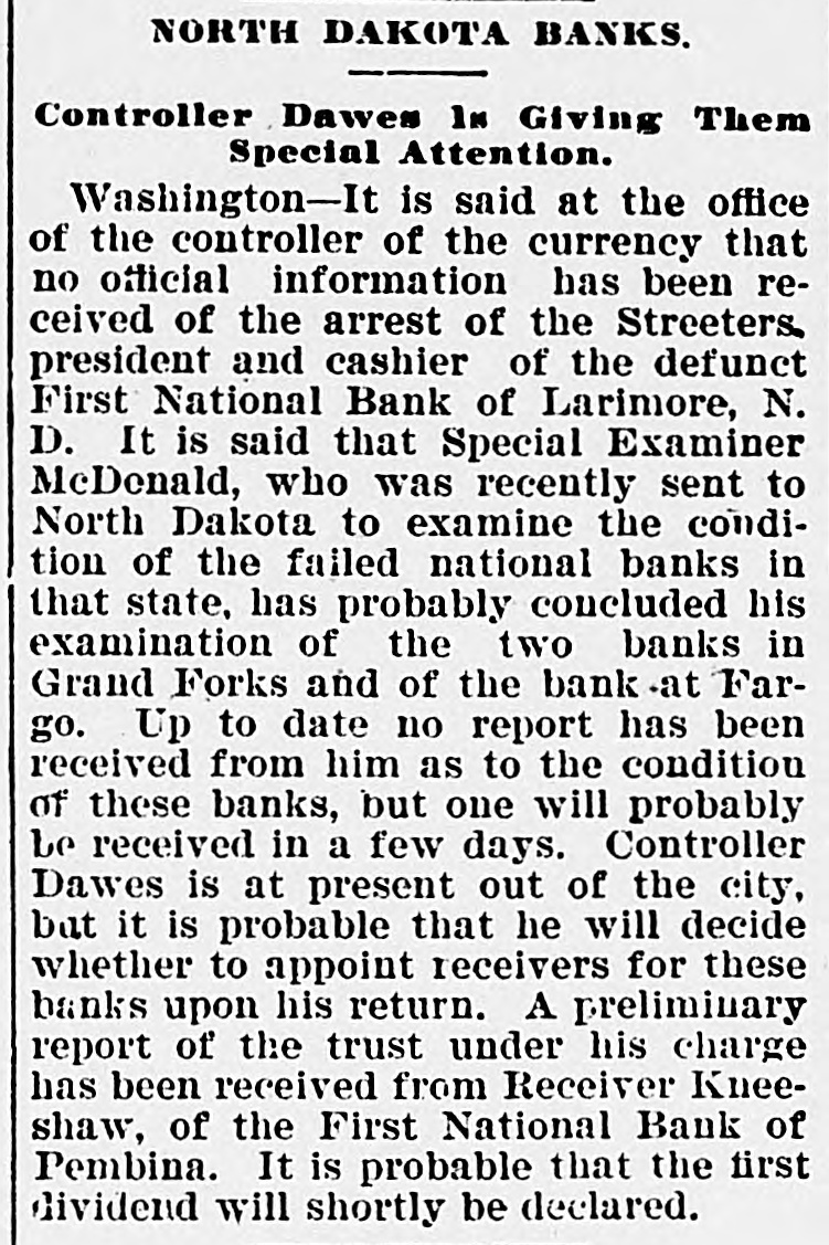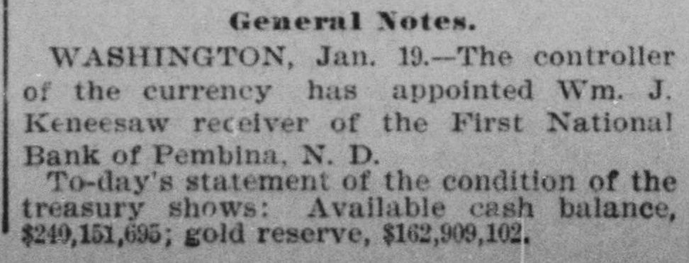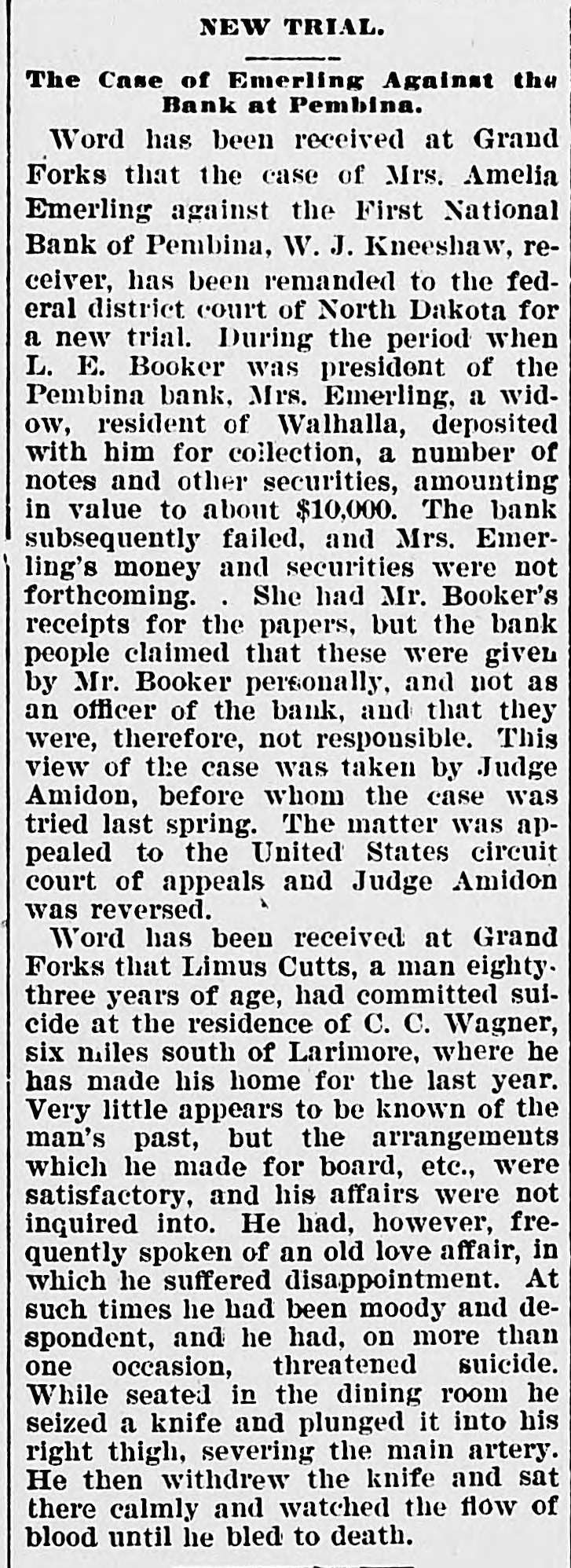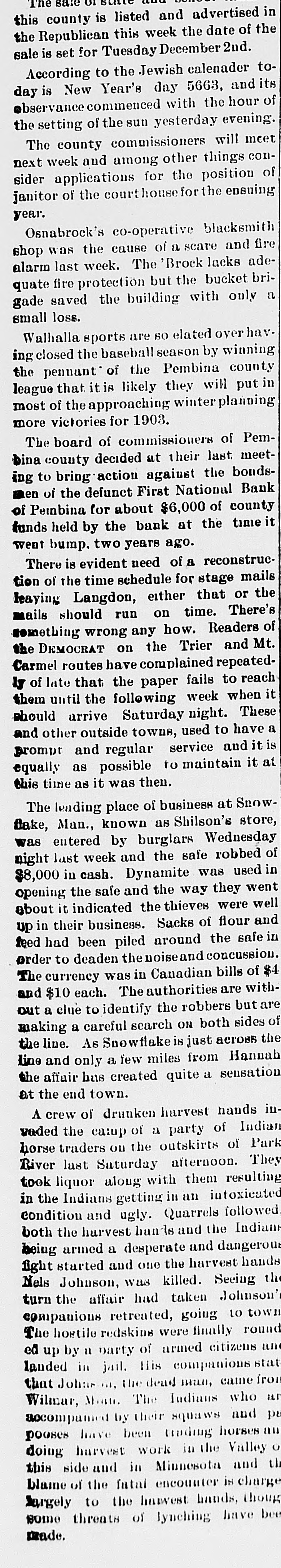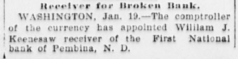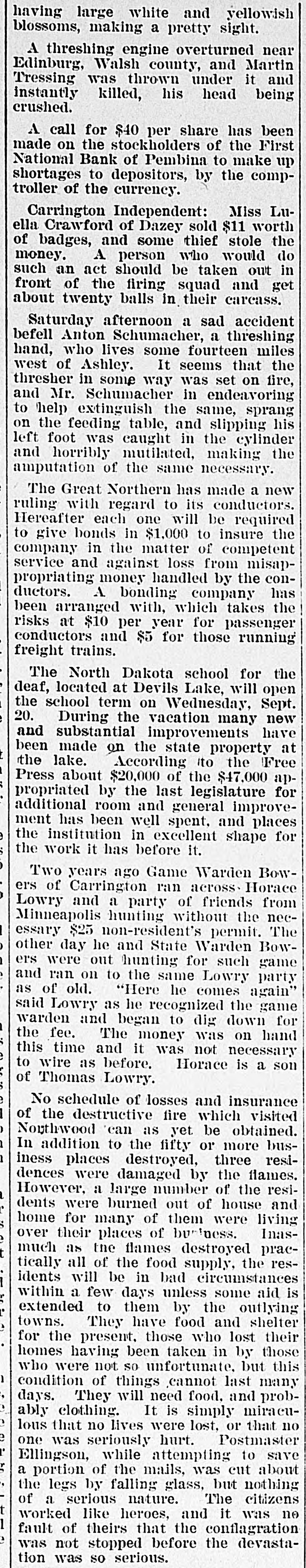 by a troney car at Newark. N. J., Wednesday. The police think it was a case of foul play. as loud voices and a scuffle were heard in the neighborhood. and from the appearance of the body. the county physician thought the man was dead before he was struck by the car. The steam saw mill and factory of the Townsend Furniture Co. at Townsend. Mass., was totally destroyed by fire, Wednesday morning. with a loss of $15.000. The property was not insured. The factory furnished employment for about 25 hands. who are not only thrown out of employment but who also lost all their tools in the fire. A special from Pembina, N. D., says: The First National Bank is in the hands of a United States bank examiner. The bany had accumulated $20,000 in valueless securities during the presidency of L. Booker. who is now a fugitive from justice. having defaulted his bond for other banking frauds. Stockholders hope to make up the deficiency and open the bank. Richard Arthur Price, who assassinated Wm. Terriss, the actor. outside of the Adelphia theatre at London, on Thursday, last, was brought up on remand at the Bow Street police court. Wednesday. charged with the crime, and was again remanded. The court was crowded with theatrical people. Emperor William, while visiting Grandenz, Tuesday, said to the burgomoister: "My solicitude for your town aims at seeing it more fully equipped as a fortress, in order it may be able to withstand any pressure in the future. I hope, however. that it may never happen, for our Eastern neighbor is a dear. loyal friend of mine, and has the same political views as myself." The steamer Kaiser Wilhem Der Grosse arrived at quarantine, New York, at 12.40 P. M., Wednesday. from Bremen, Southampton and Cherbourg after a very stormy passage. She left Cherbourg. last Wednesday. at 7.50 P. M., and reached Sandy Hook lightship at 11.20 this morning, her time being 164 hours and 20 minutes. She covered a total distance of 3050 knots at an average speed of 18.56 knots per hour. The day's runs were 338, 440, 342, 400, 401, 394 and 528 to Sandy Hook.