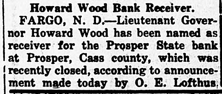 Howard Wood Bank Receiver. FARGO, N. D.-Lieutenant Governor Howard Wood has been named as receiver for the Prosper State bank at Prosper, Cass county, which was recently closed, according to announcement made today by O. E. Lofthus.