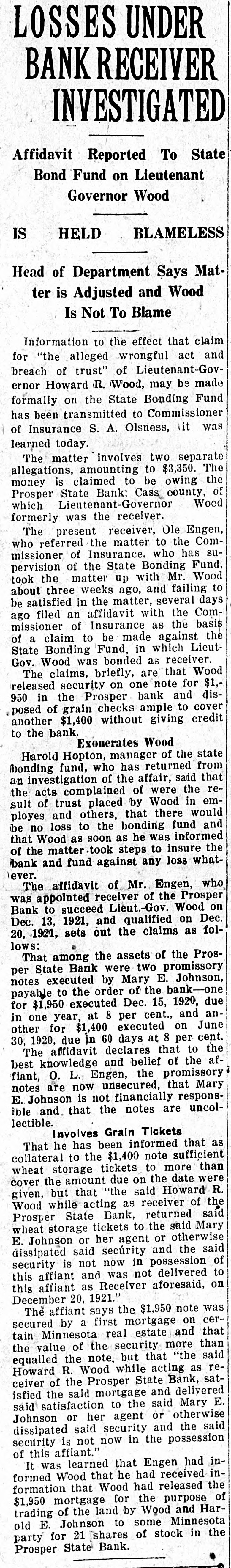 LOSSES UNDER BANK RECEIVER INVESTIGATED Affidavit Reported To State Bond Fund on Lieutenant Governor Wood IS HELD BLAMELESS Head of Department Says Matter is Adjusted and Wood Is Not To Blame Information to the effect that claim for "the alleged wrongful act and breach of trust" of Lieutenant-Governor Howard R. Wood, may be made formally on the State Bonding Fund has been transmitted to Commissioner of Insurance S. A. Olsness, \it was learned today. The matter involves two separate allegations, amounting to $3,350. The the money is claimed to be owing of Prosper State Bank: Cass county, Wood which Lieutenant-Governor formerly was the receiver. The present receiver, Ole Engen, referred the matter to the Comof Insurance. suof the State missioner pervision who Bonding who has Fund, Wood matter up with Mr. three weeks ago, and took about the several failing days to be satisfied in the matter, an affidavit with of Insurance as missioner ago filed the the Com- basis the to be made against Fund, in of State a claim Bonding which receiver. LieutGov. Wood was bonded as briefly, are that Wood security on one note released The claims, and for dis- $1, 950 in the Prosper bank posed of grain checks ample to credit cover another $1,400 without giving to the bank. Exonerates Wood Harold Hopton, manager of the state fbonding fund, who has returned from that investigation of the affair, said rean complained of were the of trust placed by and others, that ployes the sult acts Wood there fund in would em- and no loss to the bonding be as soon as he was steps to that of the Wood matter.took loss insure informed what- the bank and fund against any \ever. The affidavit of Mr. Engen, who appointed receiver of the Prosper was Bank to succeed Lieut.-Gov Wood Dec. on Dec. 13, 1921, and qualified on fol20, 1921, sets out the claims as lows: That among the assets of the ProsState Bank were two promissory notes per executed by Mary E. Johnson, to the order of the due for executed Dec. 15, payable $1,950 bank-one 1920, and in at 8 per cent., anexecuted on due in 60 days at per 30, other one 1920, for year, $1,400 8 to June cent. the The affidavit declares that knowledge and belief of the af best o. L. Engen, the promissory fiant, notes are now unsecured, that Mary Johnson is not financially respons- uncolible E. and that the notes are lectible. Involves Grain Tickets has been informed that as to the $1,400 note collateral That he sufficient than wheat storage tickets to more the amount due on the date were cover given, but that "the said Howard R. while acting as receiver of the State Bank, tickets to the wheat Prosper Wood storage returned said otherwise Mary said Johnson or her agent or said E. dissipated said security and the of security is not now in possession to affiant and was not delivered this this affiant as Receiver aforesaid, on December 20, 1921. The affiant says the $1,950 note was secured by a first mortgage on that cerreal estate and of the security more tain the value Minnesota "the than said equalled the note, but that reR. Wood while acting as the Prosper State ceiver Howard of Bank, delivered satisfied the said mortgage and E. satisfaction to the said Mary Johnson said or her agent or otherwise said dissipated said security and the security is not now in the possession of this affiant." was learned that Engen had inIt Wood that he had received the information formed that Wood had released $1,950 mortgage for the purpose Har- of trading of the land by Wood and E. Johnson to some Minnesota the party old for 21 shares of stock in Prosper State Bank.