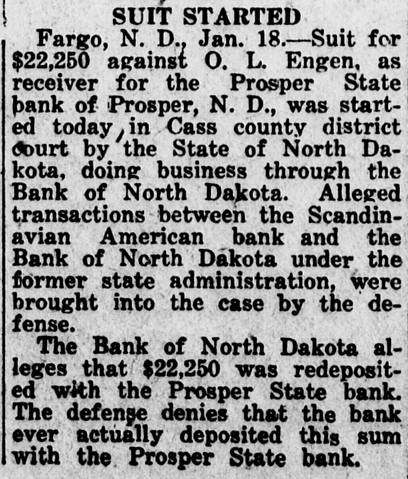 SUIT STARTED Fargo, N. D., Jan. 18.-Suit for $22,250 against O. L. Engen. as receiver for the Prosper State bank of Prosper, N. D., was started today , in Cass county district Court by the State of North Dakota, doing business through the Bank of North Dakota. Alleged transactions between the Scandinavian American bank and the Bank of North Dakota under the former state administration, were brought into the case by the defense. The Bank of North Dakota alleges that $22,250 was redeposited with the Prosper State bank. The defense denies that the bank ever actually deposited this sum with the Prosper State bank.