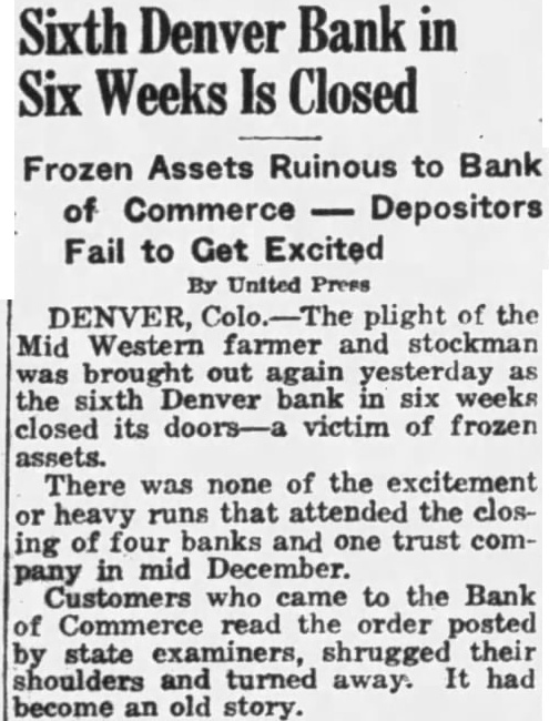 DENVER, Colo.-The plight of the Mid Western farmer and stockman was brought out again yesterday as the sixth Denver bank in six weeks closed its doors-a victim of frozen assets. There was none of the excitement or heavy runs that attended the closing of four banks and one trust company in mid December. Customers who came to the Bank of Commerce read the order posted by state examiners, shrugged their shoulders and turned away. It had become an old story.