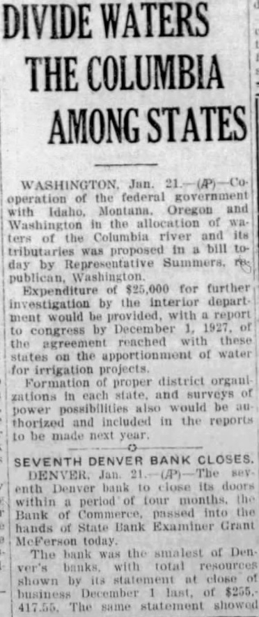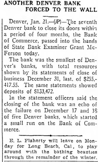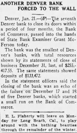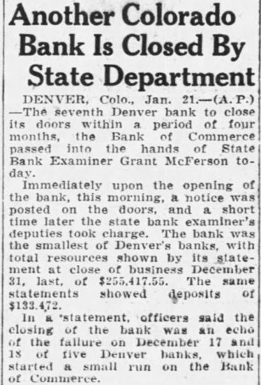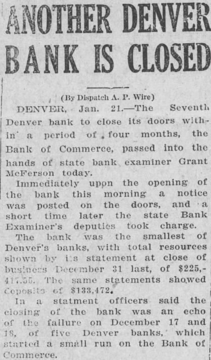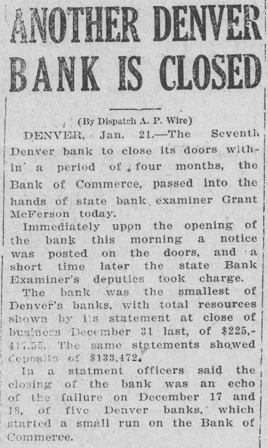 ANOTHER DENVER BANK IS CLOSED (By Dispatch A. P. Wire) DENVER, Jan. 21.-The Seventh Denver bank to close its doors within a period of four months, the Bank of Commerce, passed into the hands of state bank examiner Grant McFerson today. Immediately upon the opening of the bank this morning a notice was posted on the doors, and a short time later the state Bank Examiner's deputies took charge. The bank was the smallest of Denver's banks, with total resources shown by its statement at close of business December 31 last, of $225,417.55. The same statements showed Coposits of $133,472. In a statment officers said the closing of the bank was an echo of the failure on December 17 and 18, of five Denver banks, which started a small run on the Bank of Commerce.