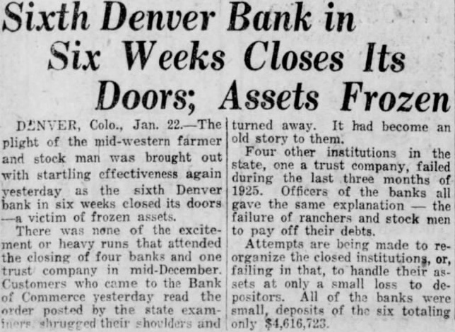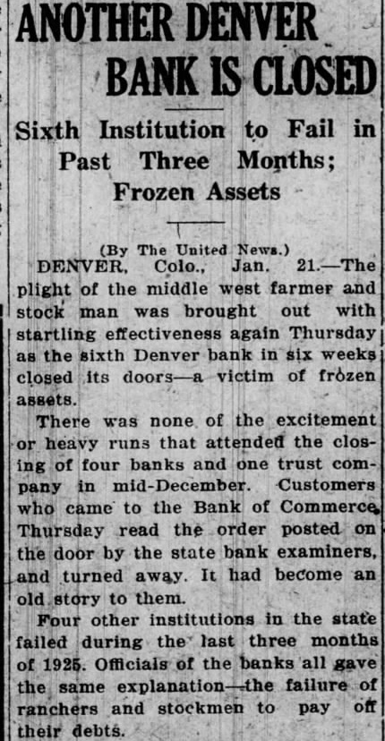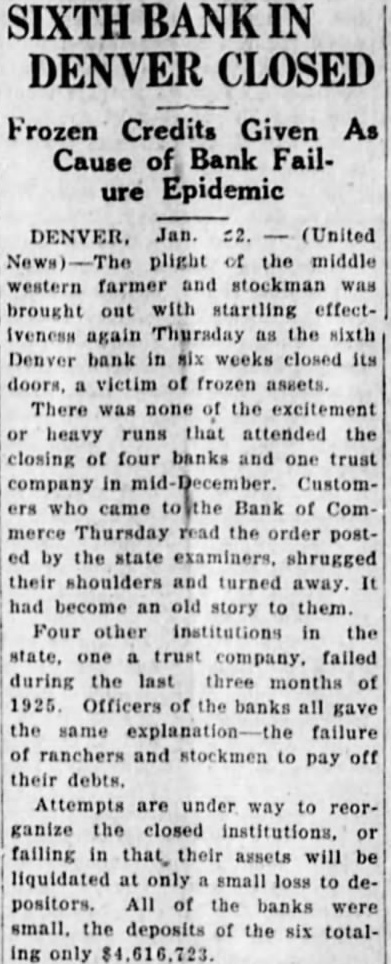 The United News.) DENVER. Colo., Jan. plight of the middle west farmer and stock man was brought out with startling effectiveness again Thursday as the sixth Denver bank in six weeks closed its doors-a victim of frozen assets. There was none of the excitement or heavy runs that attended the closing of four banks and one trust company in mid-December Customers who came to the Bank of Commerce, Thursday read the order posted on the door by the state bank examiners, and turned away It had become an old story to them. Four other institutions in the state failed during the last three months of 1925. Officials of the banks all gave the same explanation failure of ranchers and stockmen to pay off their debts.