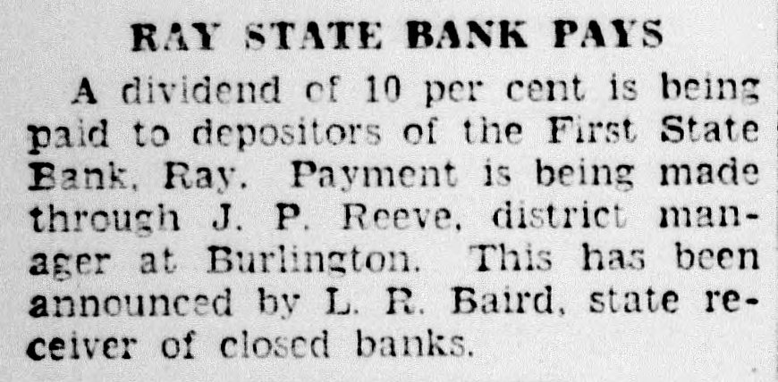 RAY STATE BANK PAYS A dividend of 10 per cent is being paid to depositors of the First State Bank. Ray. Payment is being made through J. P. Reeve, district manager at Burlington. This has been announced by L. R. Baird, state receiver of closed banks.