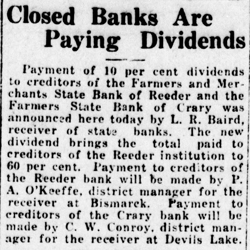 Closed Banks Are Paying Dividends Payment of 10 per cent dividends to creditors of the Farmers and Merchants State Bank of Reeder and the Farmers State Bank of Crary was announced here today by L. R. Baird, receiver of state banks. The new dividend brings the total paid to creditors of the Reeder institution to 60 per cent. Payment to creditors of the Reeder bank will be made by P. A. O'Keeffe, district manager for the receiver at Bismarck. Payment to creditors of the Crary bank will be made by C. W. Conroy. district manager for the receiver at Devils Lake.