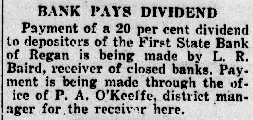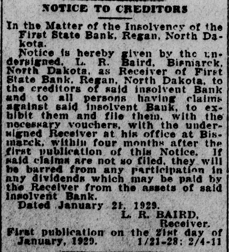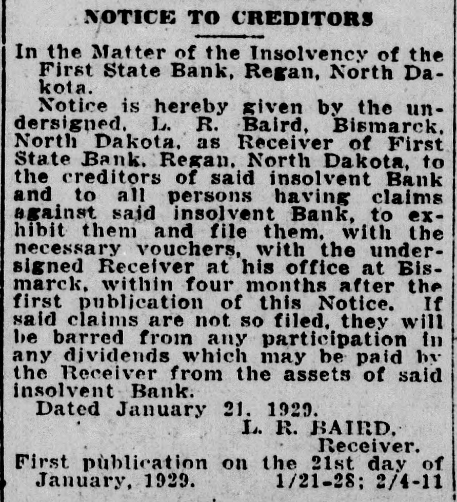 NOTICE TO CREDITORS In the Matter of the Insolvency of the First State Bank, Regan, North Dakota. Notice is hereby given by the undersigned. L. R. Baird, Bismarck, North Dakota. as Receiver of First State Bank. Regan. North Dakota, to the creditors of said insolvent Bank and to all persons having claims against said insolvent Bank, to exhibit them and file them. with the necessary vouchers, with the undersigned Receiver at his office at Bismarck, within four months after the first publication of this Notice. If said claims are not so filed, they will be barred from any participation in any dividends which may be paid by the Receiver from the assets of said insolvent Bank. Dated January 21. 1929. L. R. BAIRD. Receiver. First pùblication on the 21st day of January, 1929. 1/21-28; 2/4-11