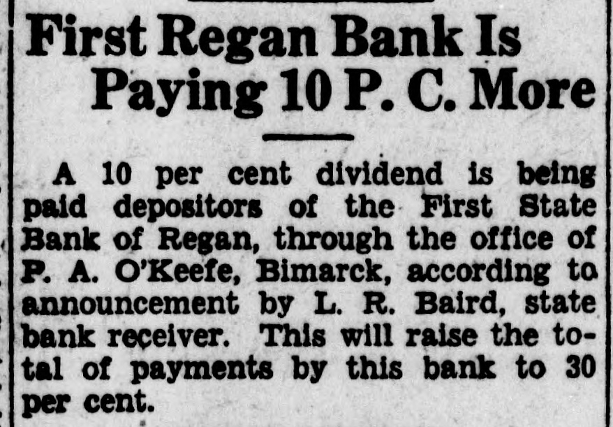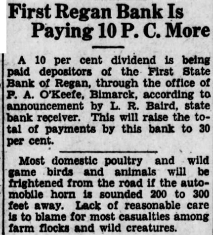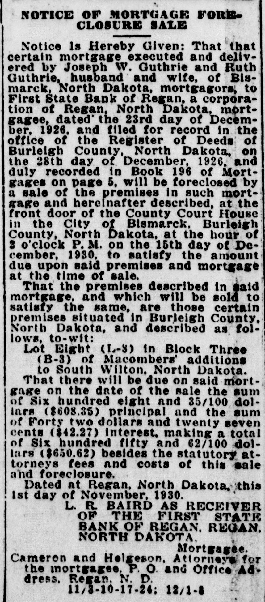 NOTICE OF MORTGAGE FORECLOSURE SALE Notice Is Hereby Given: That that certain mortgage executed and delivered by Joseph W. Guthrie and Ruth Guthrie, husband and wife, of Bismarck, North Dakota, mortgagors, to First State Bank of Regan, a corporation of Regan, North Dakota, mortgagee, dated' the 23rd day of December, 1926, and filed for record in the office of the Register of Deeds of Burleigh County, North Dakota, on the 28th day of December, 1926, and duly recorded in Book 196 of Mortgages on page 5, will be foreclosed by a sale of the premises in such mortgage and hereinafter described, at the front door of the County Court House in the City of Bismarck, Burleigh County, North Dakota, at the hour of 2 o'clock P. M. on the 15th day of December, 1930, to satisfy the amount due upon said premises and mortgage at the time of sale. That the premises described in said mortgage, and which will be sold to satisfy the same, are those certain premises situated in Burleigh County, North Dakota, and described as follows, to-wit: Lot Eight (L-3) in Block Three (B-3) of Macombers' additions to South Wilton, North Dakota. That there will be due on said mortgage on the date of the sale the sum of Six hundred eight and 35/100 dollars ($608.35) principal and the sum of Forty two dollars and twenty seven cents ($42.27) interest. making a total of Six hundred fifty and 62/100 dollars ($650.62) besides the statutory attorneys fees and costs of this sale and foreclosure. Dated at Regan, North Dakota, this 1st day of November, 1930. L. R. BAIRD AS RECEIVER OF THE FIRST STATE BANK OF REGAN, REGAN. NORTH DAKOTA. Mortgagee. Cameron and Holgeson, Attorneys for the mortgagee, P. O. and Office Address, Regan. N. D. 11/3-10-17-24; 12/1-8