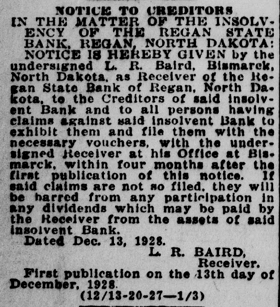 NOTICE TO CREDITORS IN THE MATTER OF THE INSOLVENCY OF THE REGAN STATE BANK, REGAN, NORTH DAKOTA: NOTICE IS HEREBY GIVEN by the undersigned L. R. Baird, Bismarck, North Dakota, as Receiver of the Regan State Bank of Regan, North Dakota, to the Creditors of said insolvent Bank and to all persons having claims against said insolvent Bank to exhibit them and file them with the necessary vouchers, with the undersigned Receiver at his Office at Bismarck, within four months after the first publication of this notice. If said claims are not so filed. they will be harred from any participation in any dividends which may be paid by the Receiver from the assets of said insolvent Bank. Dated Dec. 13, 1928. L R. BAIRD, Receiver. First publication on the 13th day of December, 1928. (12/13-20-27-1/3)