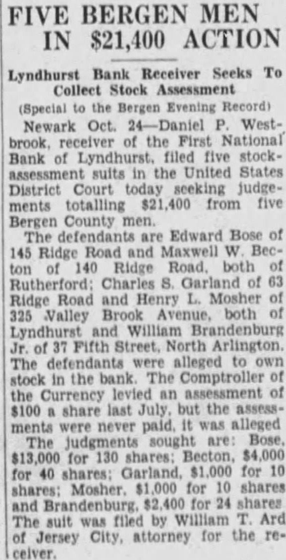 FIVE BERGEN MEN IN $21,400 ACTION Lyndhurst Bank Receiver Seeks To (Special Evening Newark Oct. Westthe National Bank filed stocksuits the United States District seeking totalling from five ments Bergen County Edward Bose 145 Ridge Road Maxwell 140 Ridge both Rutherford: Charles Garland of Ridge Road Henry Mosher 325 Valley Brook both Lyndhurst William Brandenburg of Fifth North Arlington The defendants alleged to the The Comptroller Currency assessment share last but the assess paid, alleged sought for 130 for Garland, for Mosher. for shares suit William Ard was Jersey attorney for the re-