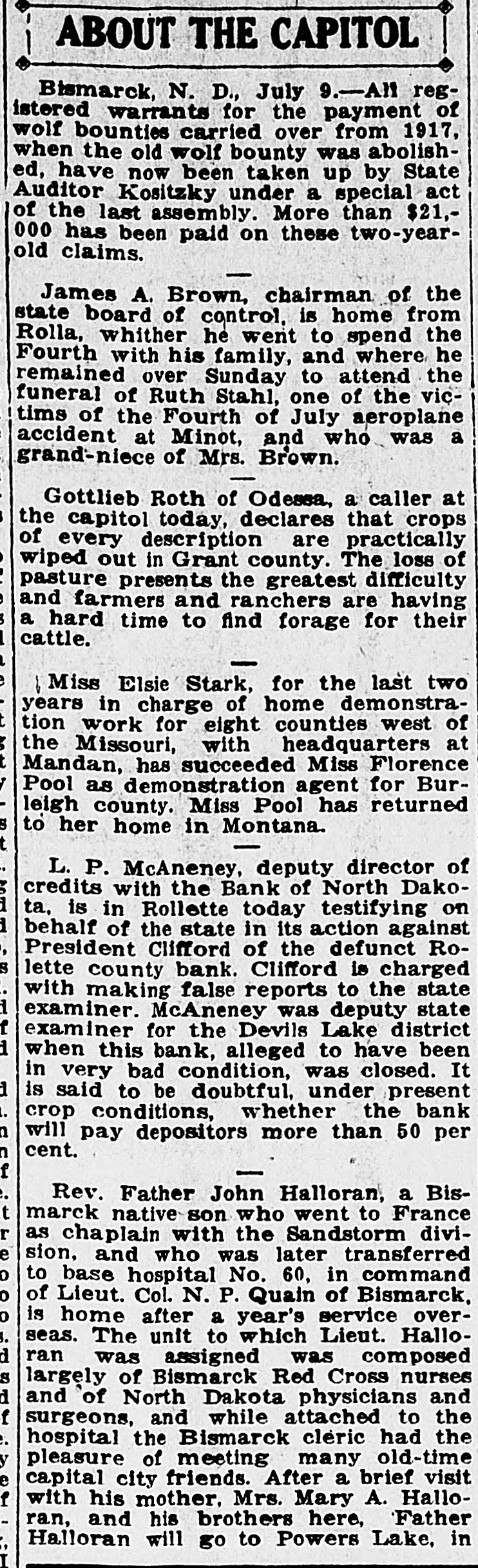 ABOUT THE CAPITOL Bismarck, N. D., July 9.-All registered warrants for the payment of wolf bounties carried over from 1917, when the old wolf bounty was abolished, have now been taken up by State Auditor Kositzky under a special act of the last assembly. More than $21,000 has been paid on these two-yearold claims. James A. Brown, chairman of the state board of control, is home from Rolla, whither he went to spend the Fourth with his family, and where he remained over Sunday to attend the funeral of Ruth Stahl, one of the victims of the Fourth of July aeroplane accident at Minot, and who was a grand-niece of Mrs. Brown. Gottlieb Roth of Odessa, a caller at the capitol today, declares that crops of every description are practically wiped out in Grant county. The loss of pasture presents the greatest difficulty and farmers and ranchers are having a hard time to find forage for their cattle. 1 Miss Elsie Stark, for the last two years in charge of home demonstration work for eight counties west of the Missouri, with headquarters at Mandan, has succeeded Miss Florence Pool as demonstration agent for Burleigh county. Miss Pool has returned to her home in Montana. L. P. McAneney, deputy director of credits with the Bank of North Dakota, is in Rollette today testifying on behalf of the state in its action against President Clifford of the defunct Rolette county bank. Clifford is charged with making false reports to the state examiner. McAneney was deputy state examiner for the Devils Lake district when this bank, alleged to have been in very bad condition, was closed. It a is said to be doubtful, under present crop conditions, whether the bank will pay depositors more than 50 per cent. Rev. Father John Halloran, a Bismarck native son who went to France as chaplain with the Sandstorm divie sion, and who was later transferred to base hospital No. 60, in command of Lieut. Col. N. P. Quain of Bismarck, is home after a year's service overseas. The unit to which Lieut. Hallod ran was assigned was composed S largely of Bismarck Red Cross nurses d and of North Dakota physicians and surgeons, and while attached to the hospital the Bismarck cleric had the pleasure of meeting many old-time capital city friends. After a brief visit f with his mother. Mrs. Mary A. Halloran, and his brothers here, Father Halloran will go to Powers Lake, in