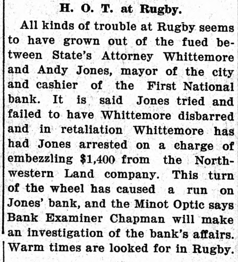 H. O. T. at Rugby. All kinds of trouble at Rugby seems to have grown out of the fued between State's Attorney Whittemore and Andy Jones, mayor of the city and cashier of the First National bank. It is said Jones tried and failed to have Whittemore disbarred and in retaliation Whittemore has had Jones arrested on a charge of embezzling $1,400 from the Northwestern Land company. This turn of the wheel has caused a run on Jones' bank, and the Minot Optic says Bank Examiner Chapman will make an investigation of the bank's affairs. Warm times are looked for in Rugby.