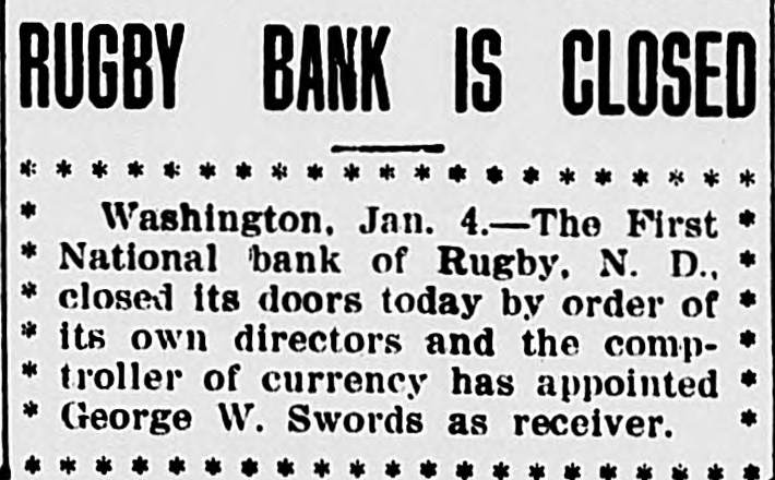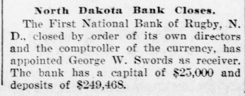 North Dakota Bank Closes. The First National Bank of Rugby, N. D., closed by order of its own directors and the comptroller of the currency, has appointed George W. Swords as receiver. The bank has a capital of $25,000 and deposits of $249,468.