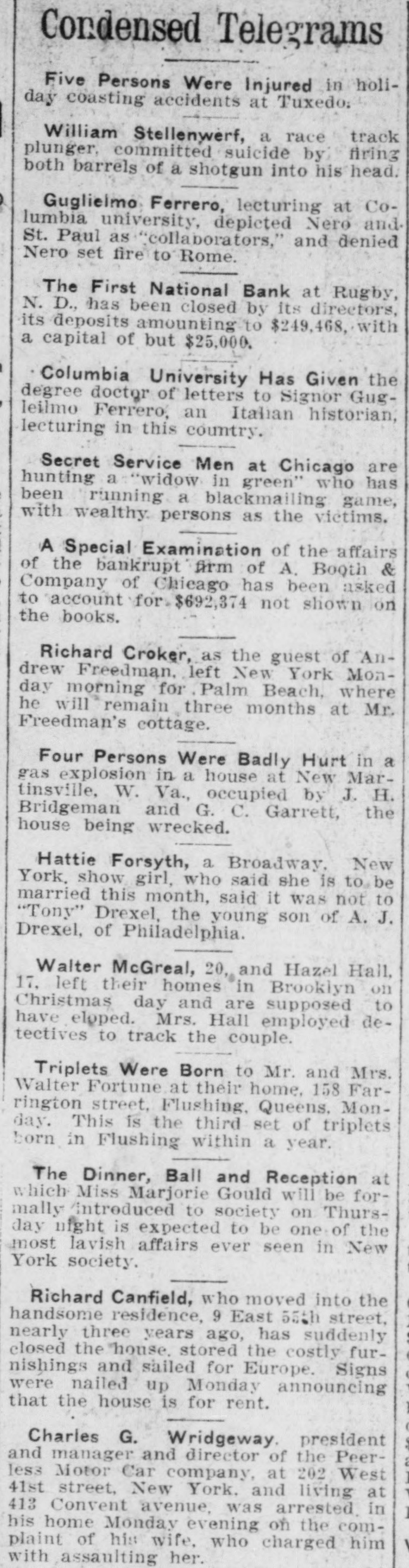Condensed Telegrams Five Persons Were Injured in holiday coasting accidents at Tuxedo: William Stellenwerf, a race track plunger, committed suicide by firing both barrels of a shotgun into his head. Guglielmo Ferrero, lecturing at Columbia university, depicted Nero and St. Paul as collaborators," and denied Nero set fire to Rome. The First National Bank at Rugby, N. D., has been closed by its directors, its deposits amounting to $249,468, with a capital of but $25,000. Columbia University Has Given the degree doctor of letters to Signor Gugleilmo Ferrero, an Italian historian, lecturing in this country. Secret Service Men at Chicago are hunting a widow in green" who has been running a blackmailing game, with wealthy. persons as the victims. A Special Examination of the affairs of the bankrupt firm of A. Boqth & Company of Chicago has been asked to account for $692,374 not shown on the books. Richard Croker, as the guest of Andrew Freedman, left New York Monday morning for Palm Beach, where he will remain three months at Mr. Freedman's cottage. Four Persons Were Badly Hurt in a gas explosion in a house at New Martinsville, W. Va., occupied by J. H. Bridgeman and G. C. Garrett, the house being wrecked. Hattie Forsyth, a Broadway, New York, show girl, who said she is to be married this month, said it was not to "Tony" Drexel, the young son of A. J. Drexel, of Philadelphia. Walter McGreal, 20, and Hazel Hall, 17. left their homes in Brooklyn on Christmas day and are supposed to have elpped. Mrs. Hall employed detectives to track the couple. Triplets Were Born to Mr. and Mrs. Walter Fortune at their home. 158 Farrington street, Flushing, Queens. Monday. This is the third set of triplets born in Flushing within a year. The Dinner, Ball and Reception at which Miss Marjorie Gould will be formally /introduced to society on Thursday night is expected to be one of the most lavish affairs ever seen in New York society. Richard Canfield, who moved into the handsome residence, 9 East 55th street, nearly three years ago, has suddenly closed the house. stored the costly furnishings and sailed for Europe. Signs were nailed up Monday announcing that the house is for rent. Charles G. Wridgeway. president and manager and director of the Peerless Motor Car company, at 202 West 41st street, New York. and living at 413 Convent avenue, was arrested in his home Monday evening on the complaint of his wife, who charged him with assaulting her.