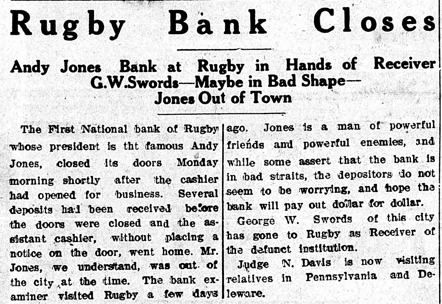 Rugby Bank Closes Andy Jones Bank at Rugby in Hands of Receiver G.W.Swords-Maybe in Bad Shape— Jones Out of Town ago. Jones is a man of powerful The First National bank of Rugby friends and powerful enemies, and whose president is tht famous Andy while some assert that the bank is Jones, closed its doors Monday in bad straits, the depositors do not morning shortly after the cashier seem to be worrying, and hope the had opened for business. Several bank will pay out dollar for dollar. deposits had been received before George W. Swords of this city the doors were closed and the ashas gone to Rugby as Receiver of sistant cashier, without placing a the defunct institution. notice on the door, went home. Mr. Judge N. Davis is now visiting Jones, we understand, was out. of relatives in Pennsylvania and Dethe city at the time. The bank examiner visited Rugby a few days leware.